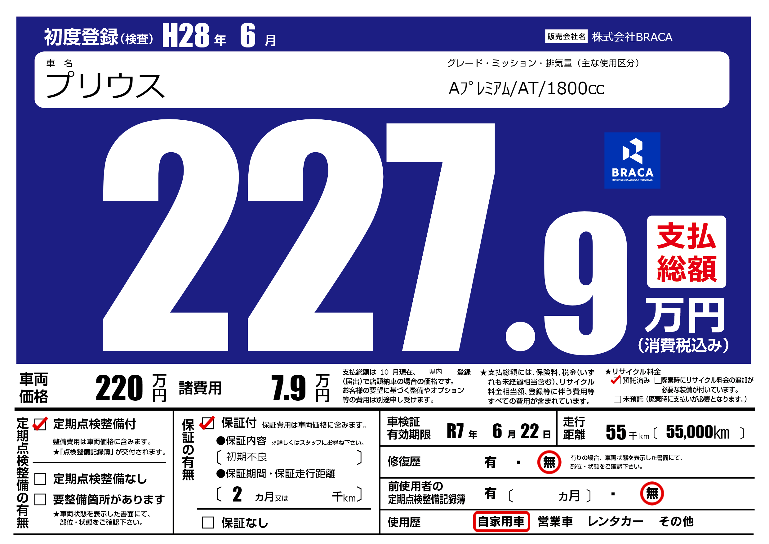 | 走行キロ | 5.5万km | 初年度登録 | H28年6月 |