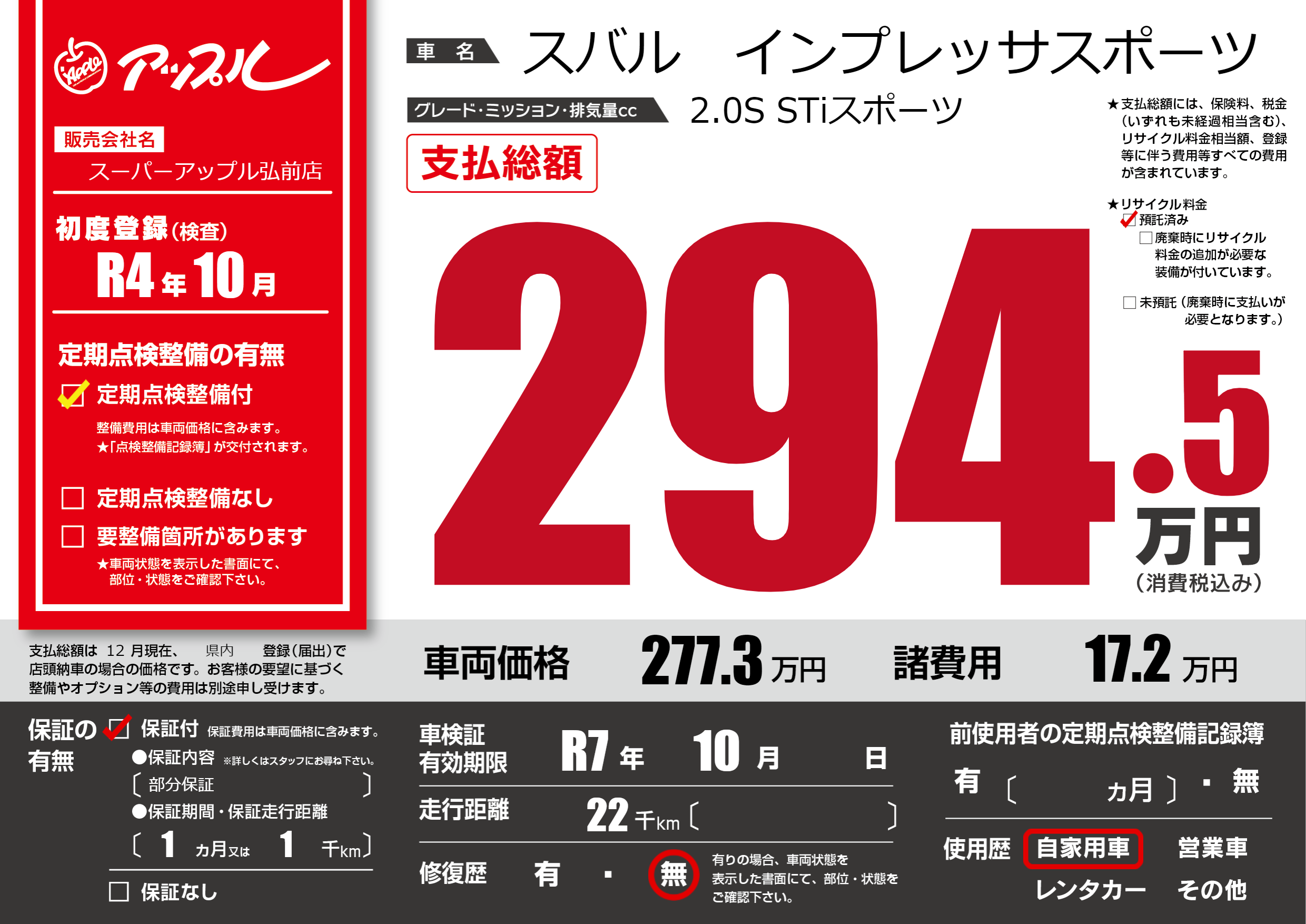| 車名 | スバル インプレッサスポーツ | グレード ミッション 排気量 |