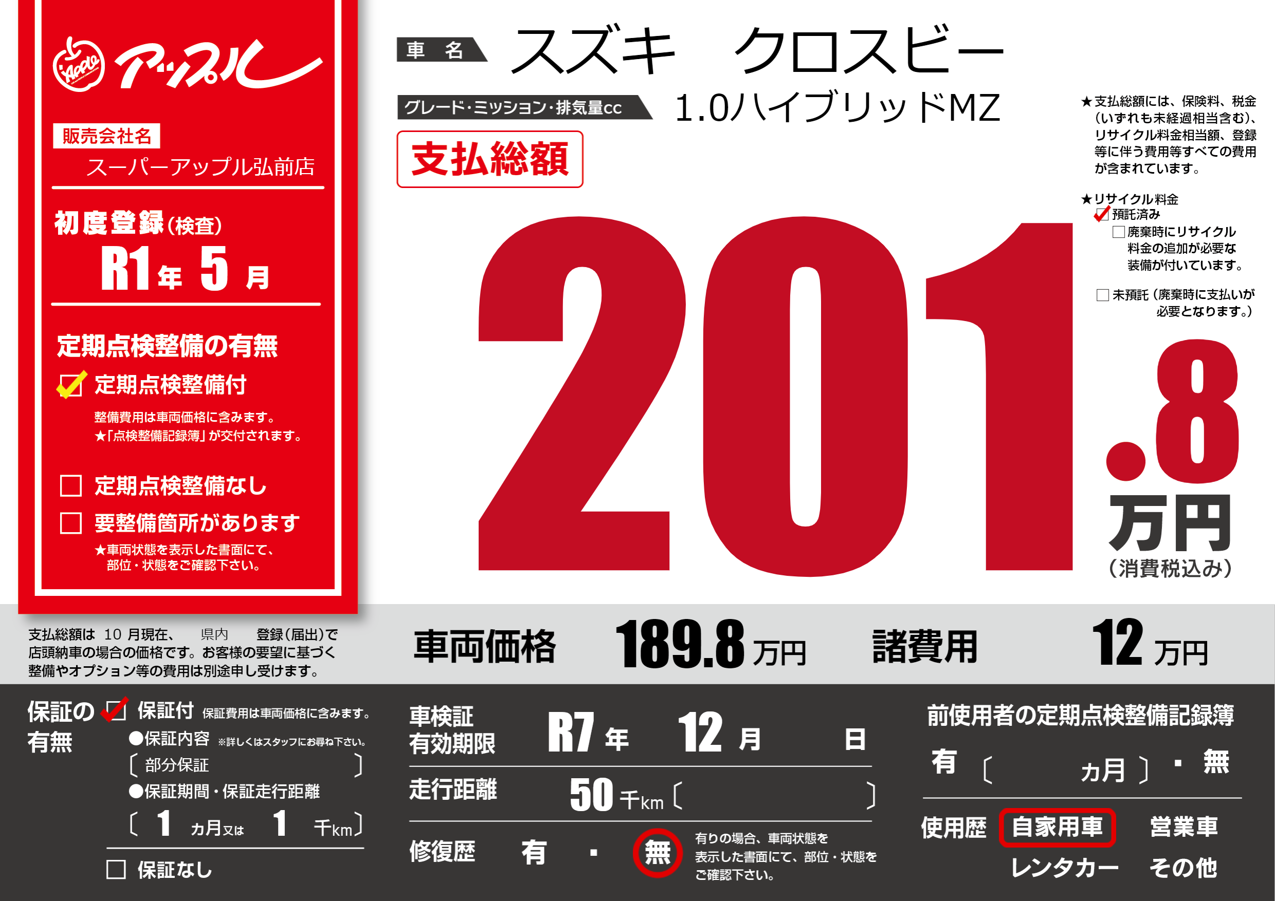 | 車名 | スズキ クロスビー | グレード ミッション 排気量 |
