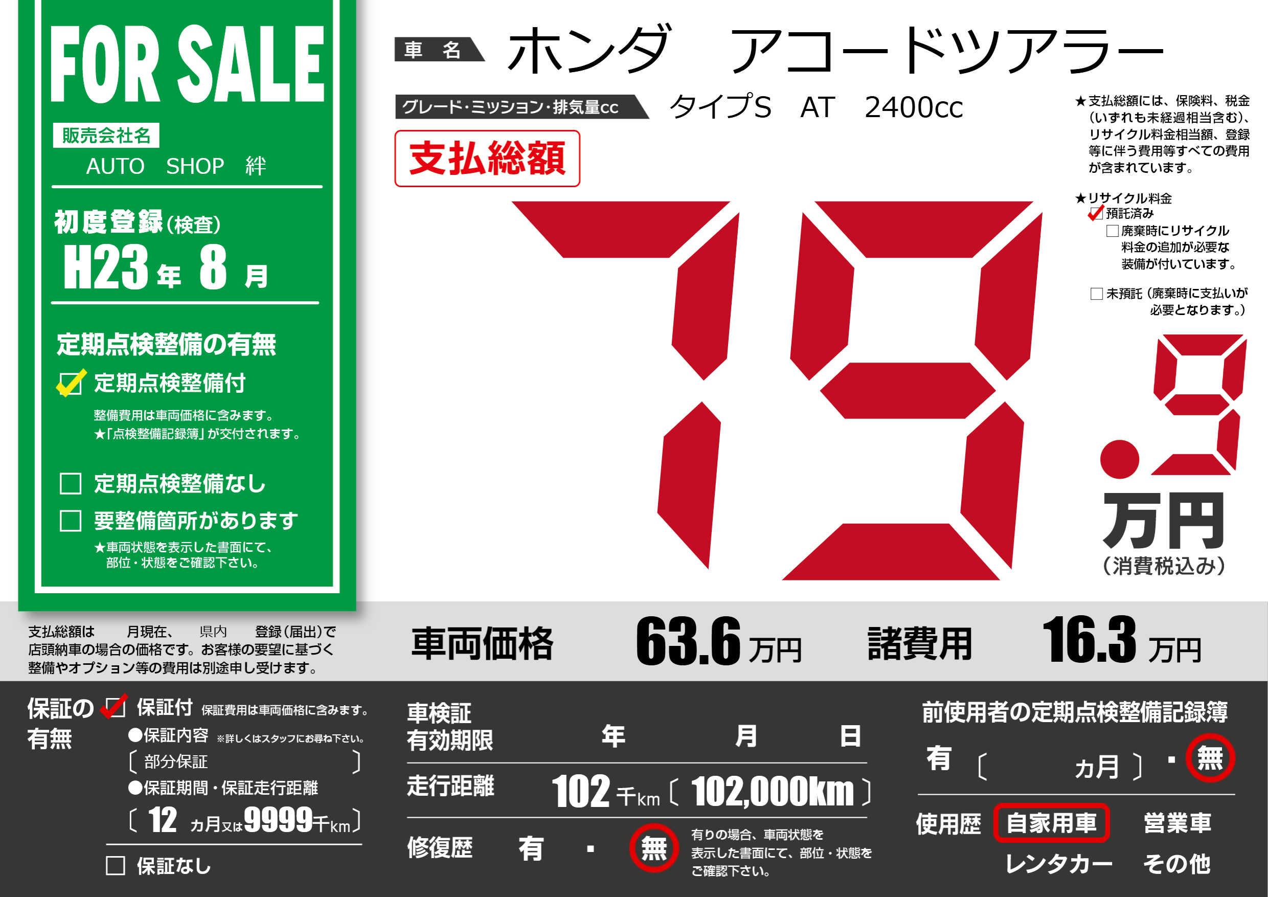 保証付き 保証内容(部分保証) 12ヶ月または(9999)千kmまで |