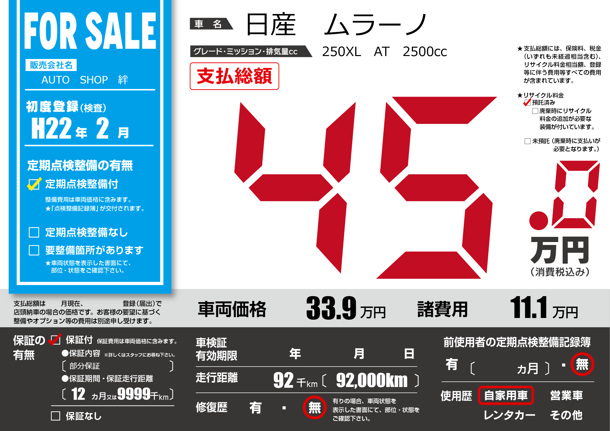 | 車名 | 日産 ムラーノ | グレード ミッション 排気量 |