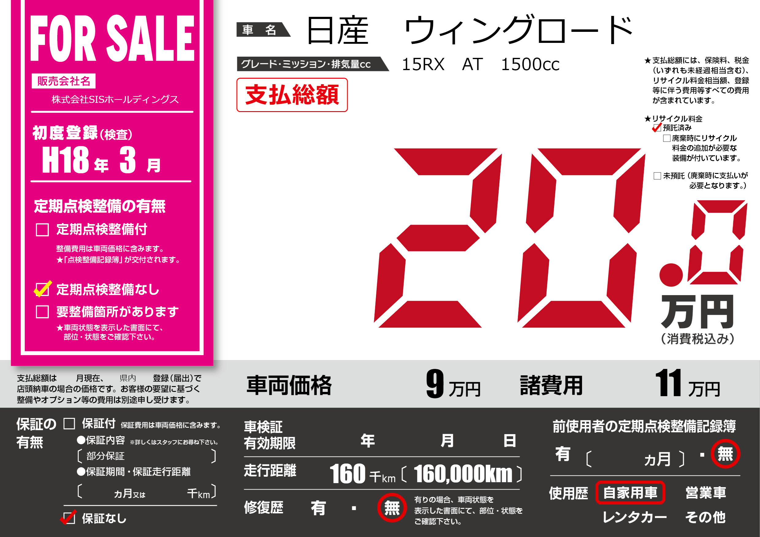 | 車名 | 日産 ウィングロード | グレード ミッション 排気量 |