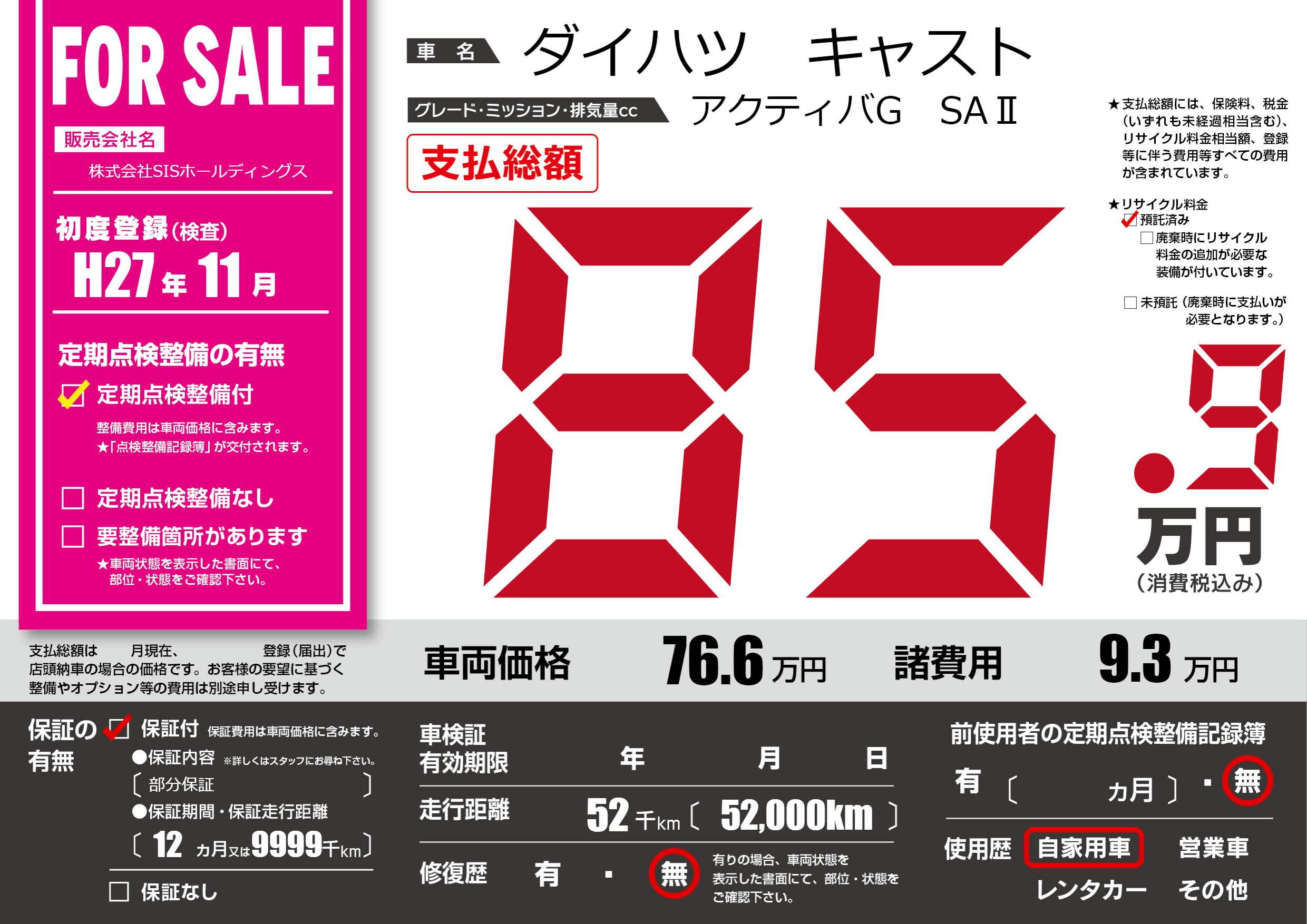 | 走行キロ | 5.2万km | 初年度登録 | H27年11月 |