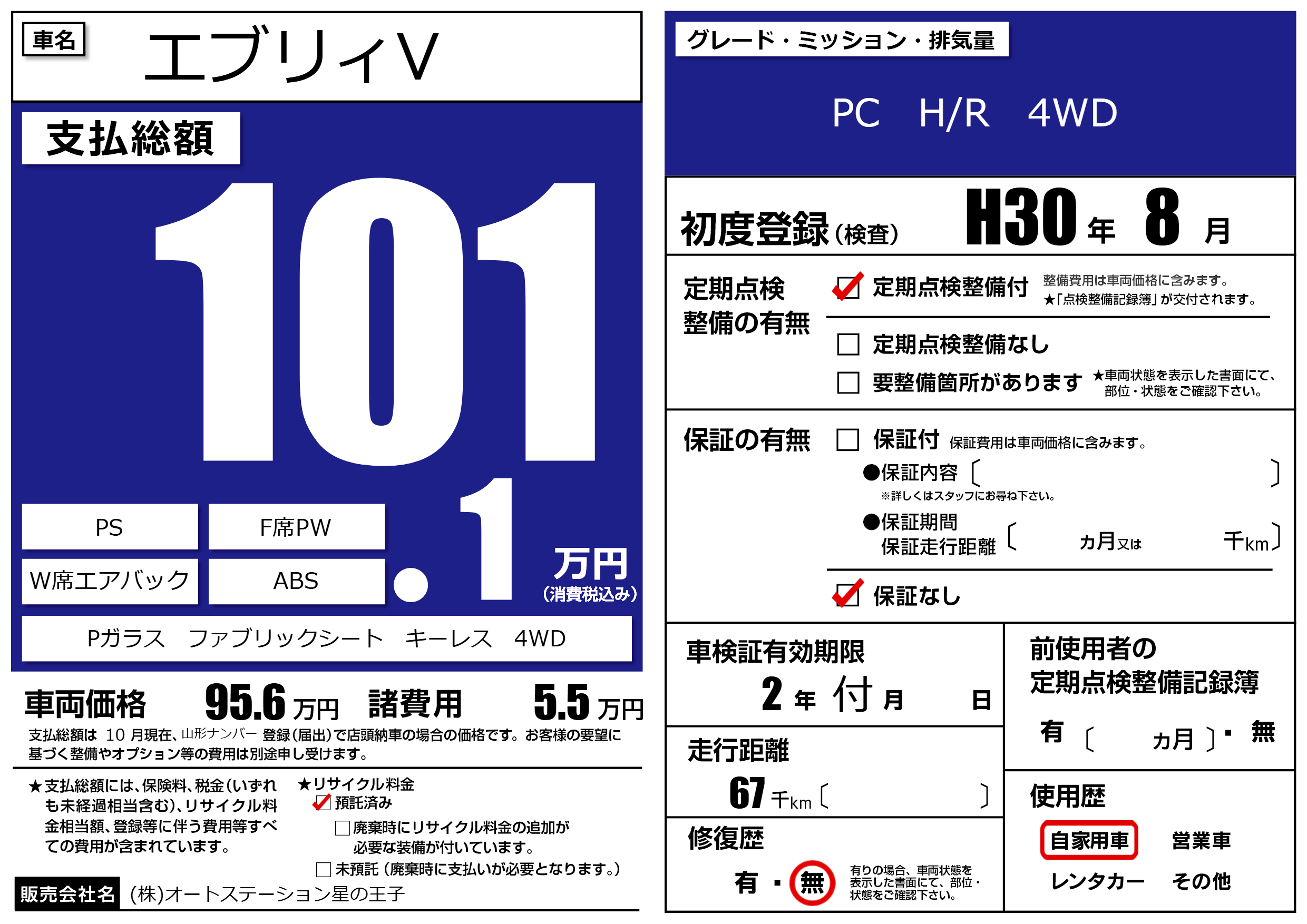 | 車名 | エブリィV | グレード ミッション 排気量 |