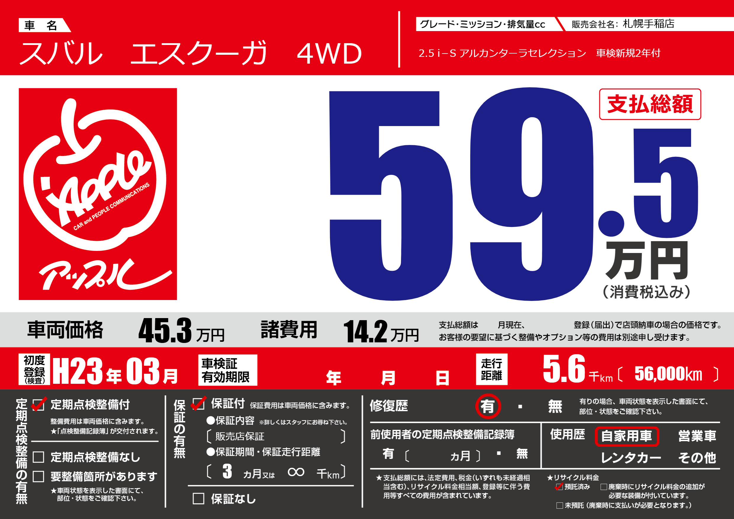 | 走行キロ | 0.5万km | 初年度登録 | H23年03月 |