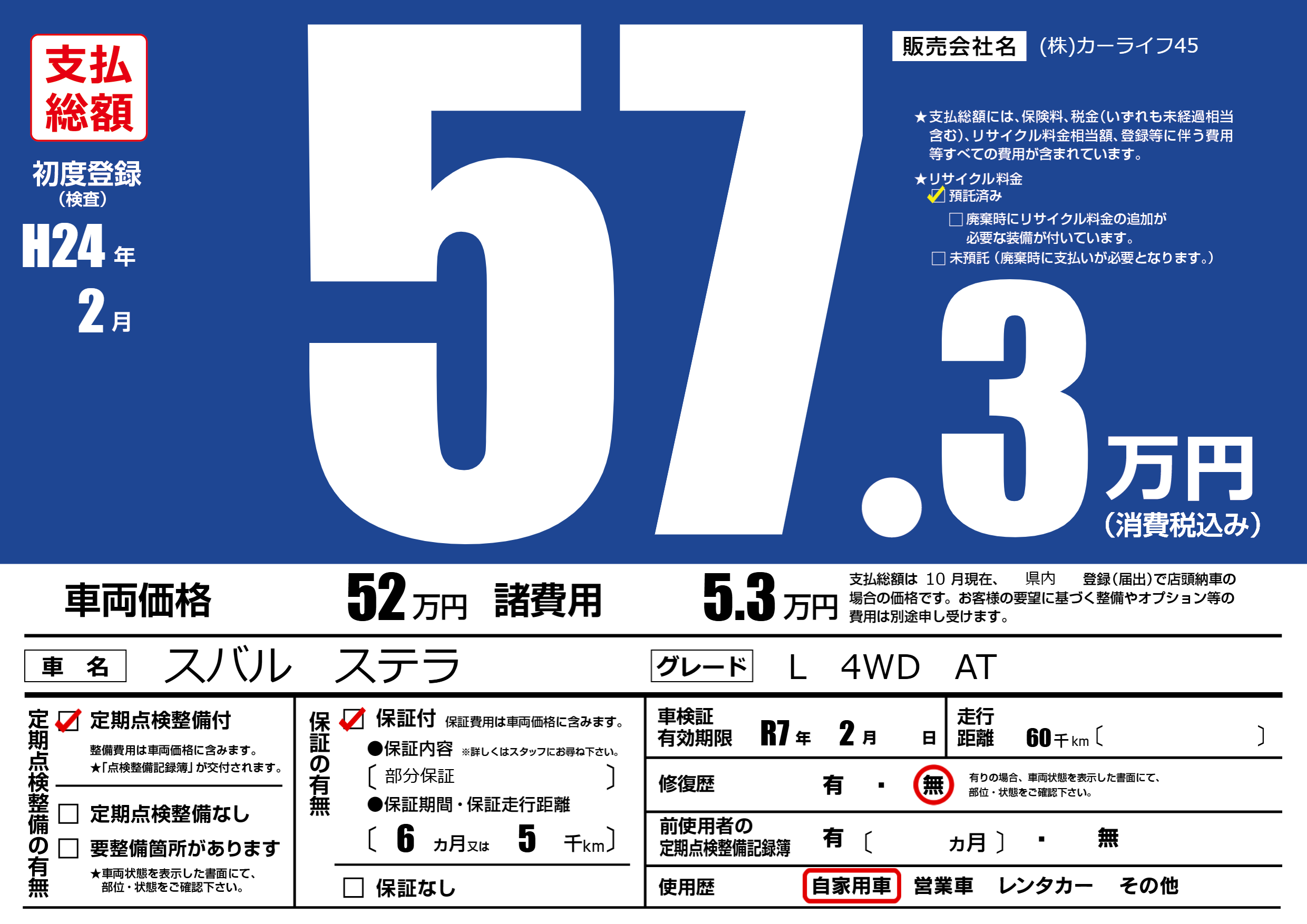 | 車検制限 | R7年 2月 - 日 | ||