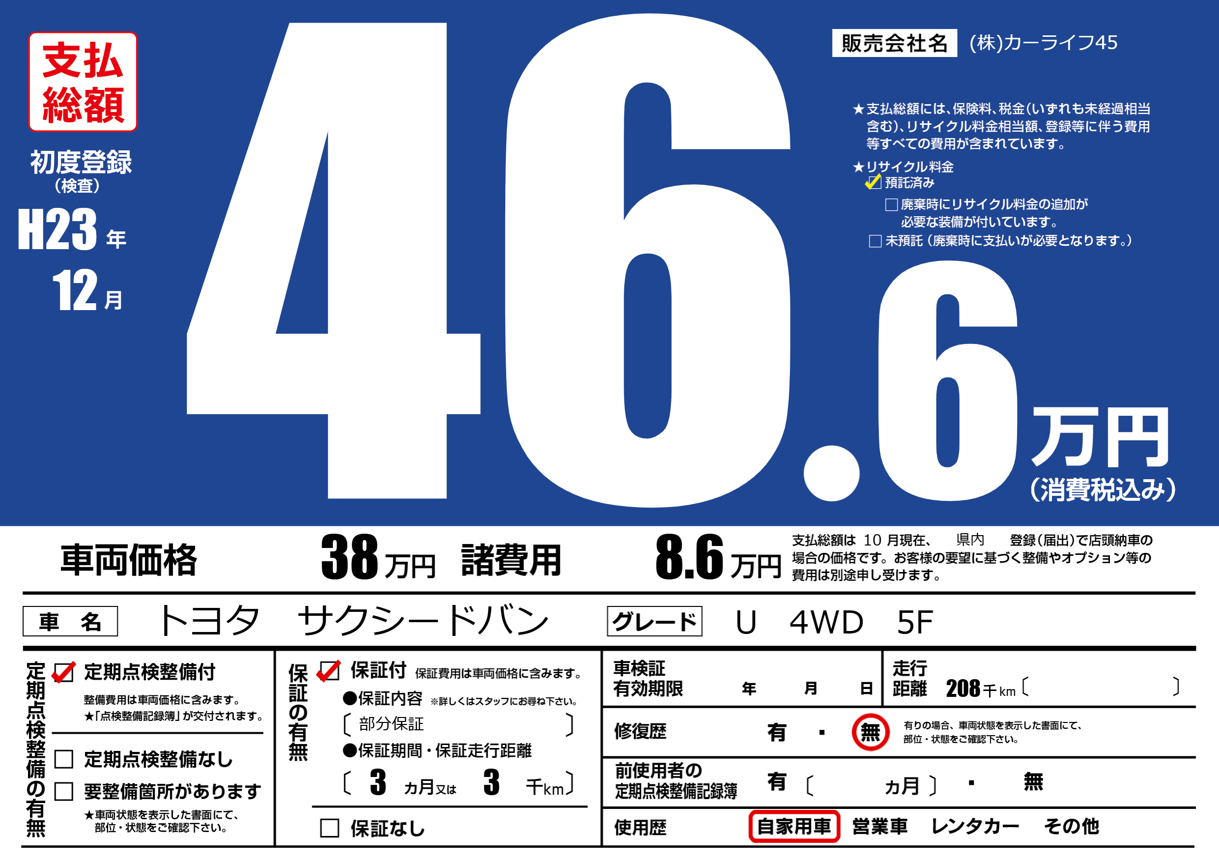 | 走行キロ | 20.8万km | 初年度登録 | H23年12月 |