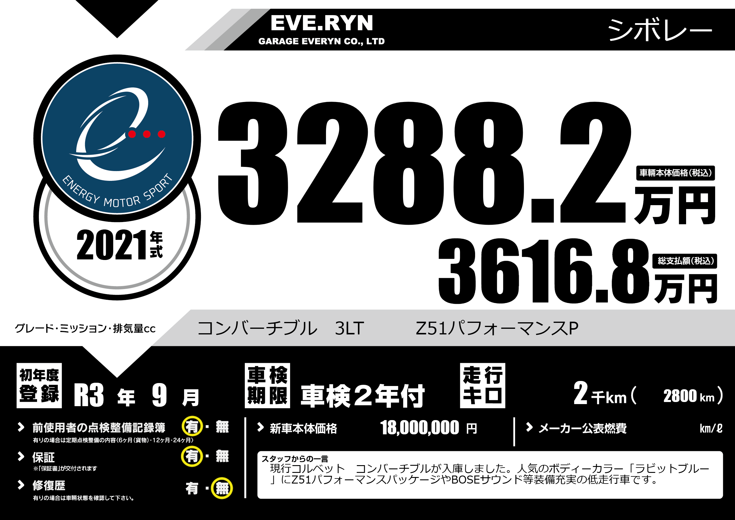 | 走行キロ | 0.2万km | 初年度登録 | R3年9月 |