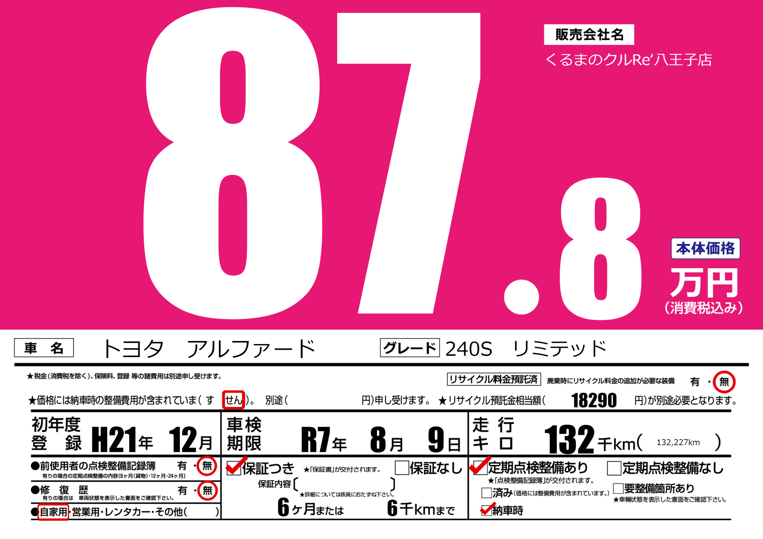 | 車名 | トヨタ アルファード | グレード ミッション 排気量 |