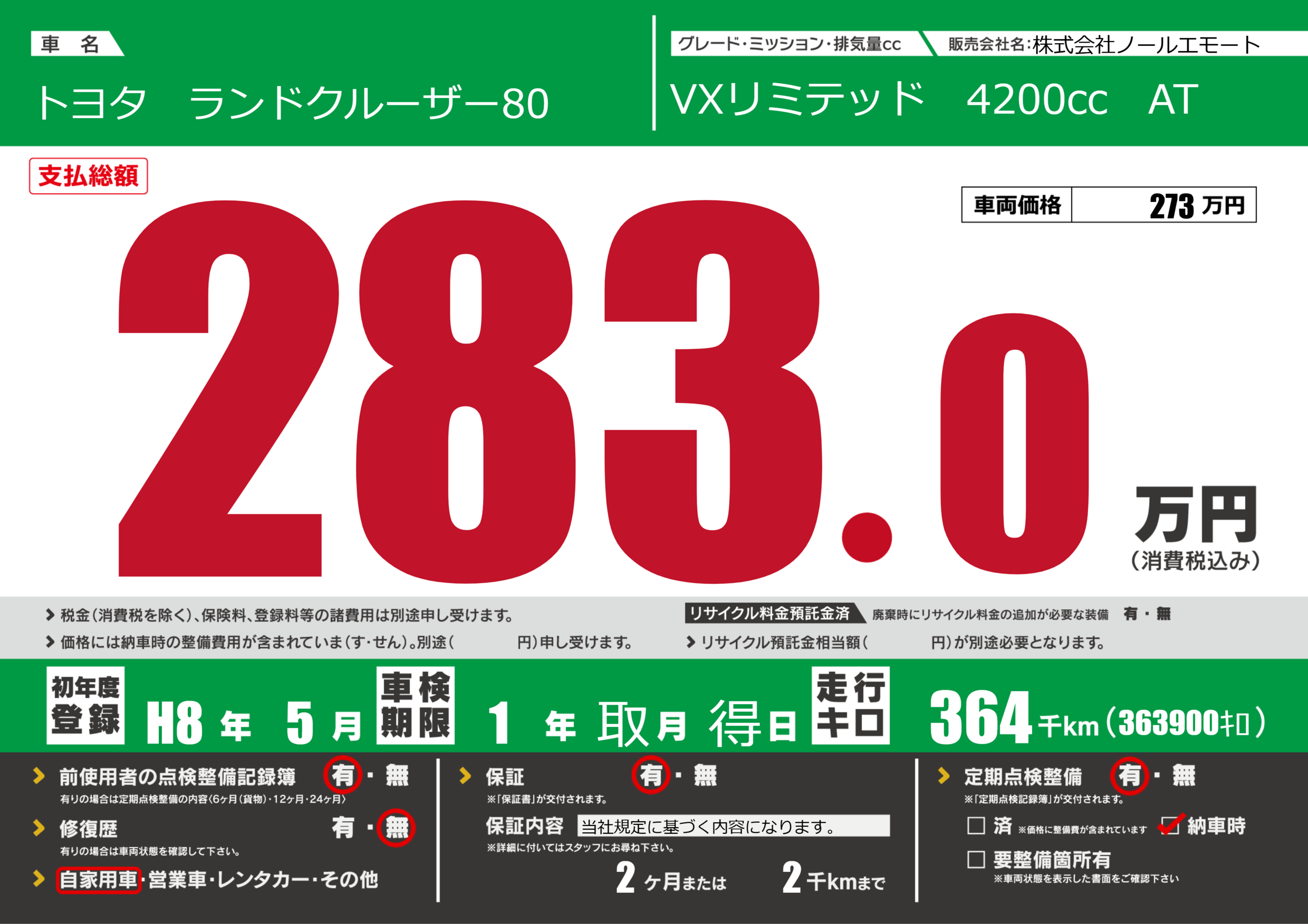 | 車名 | トヨタ ランドクルーザー80 | グレード ミッション 排気量 |