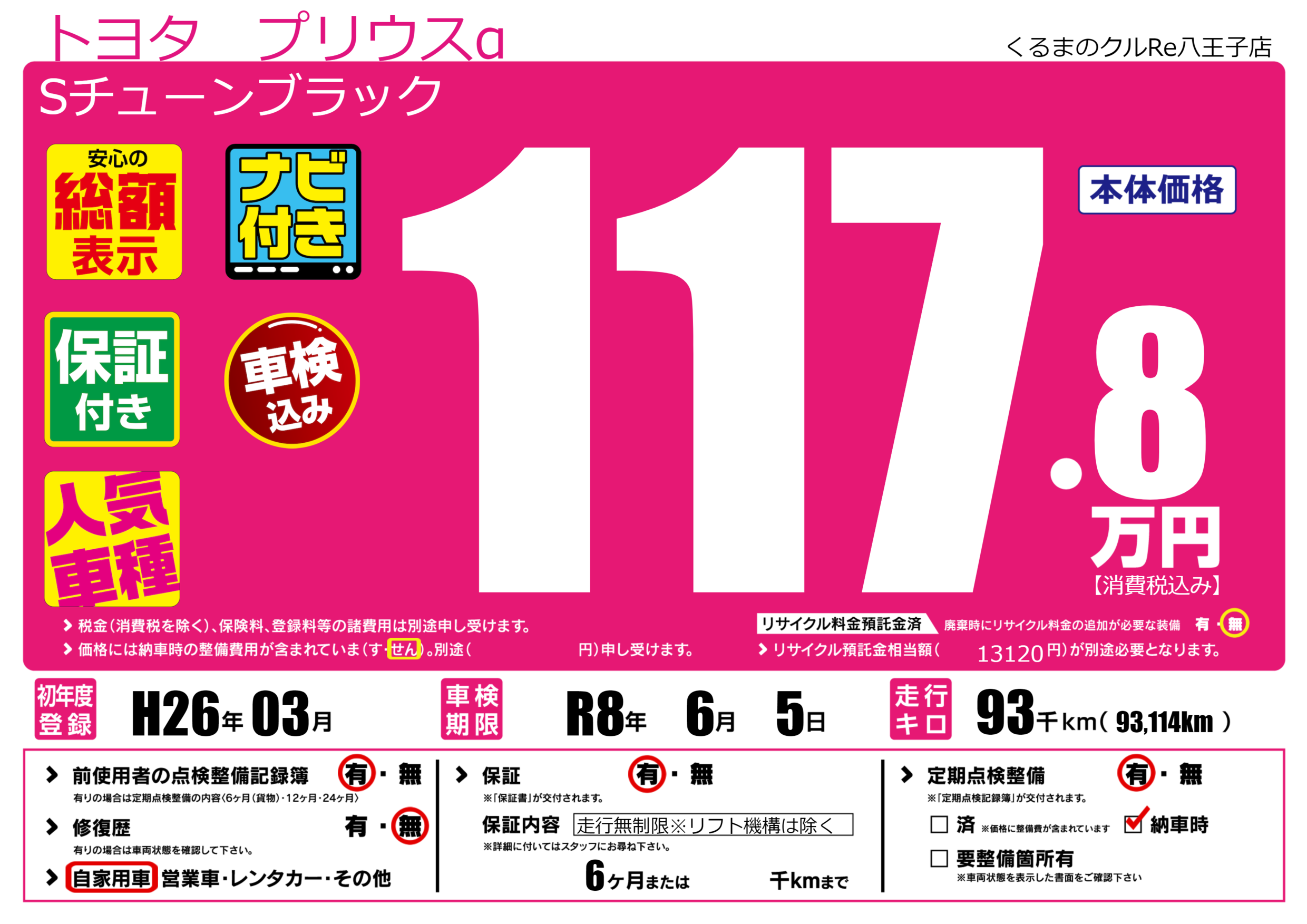 | 車名 | トヨタ プリウスα | グレード ミッション 排気量 |