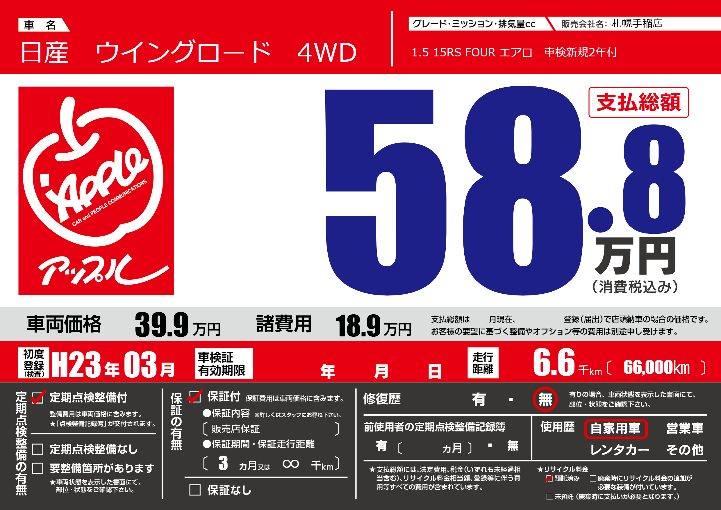 | 車名 | 日産 ウイングロード 4WD | グレード ミッション 排気量 |
