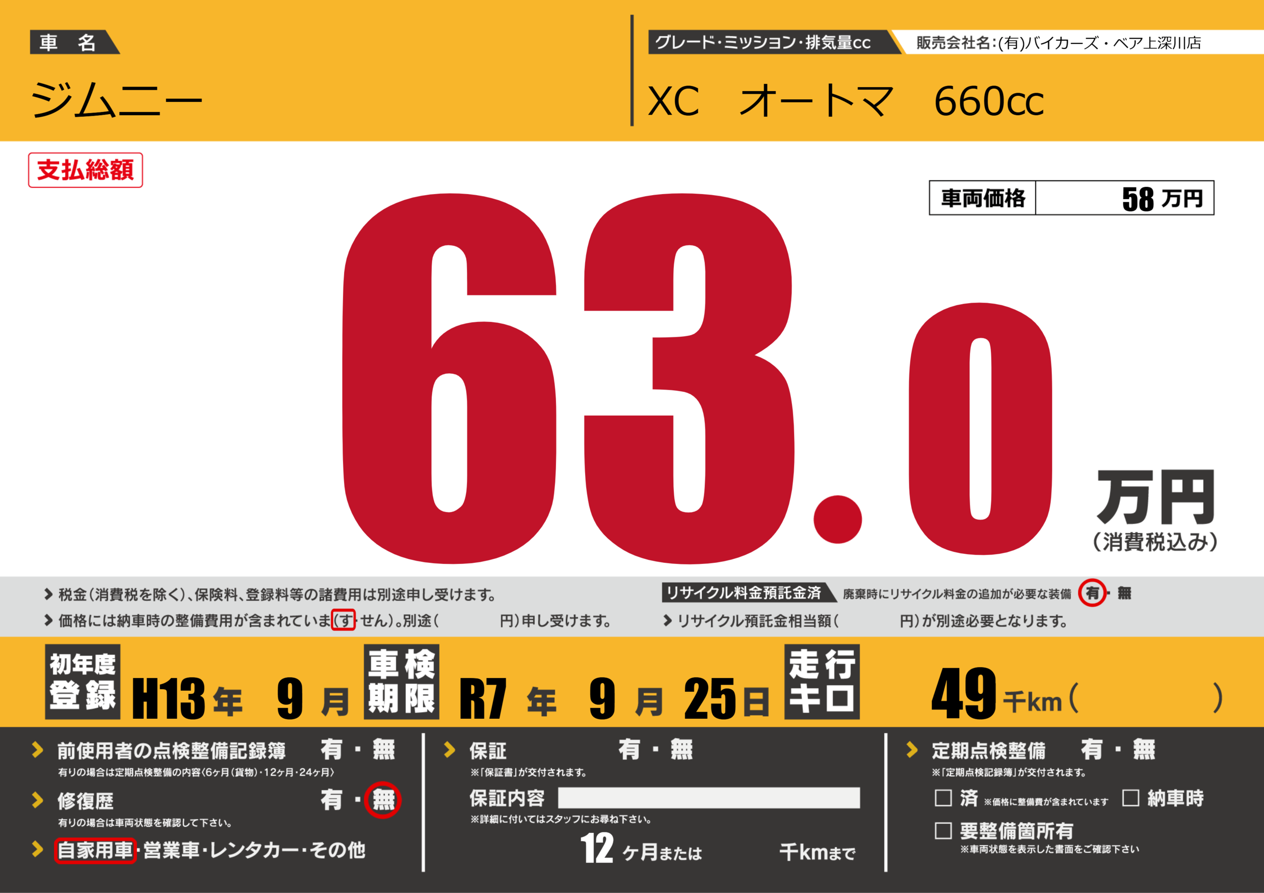 | 車検制限 | R7年 9月 25日 | ||