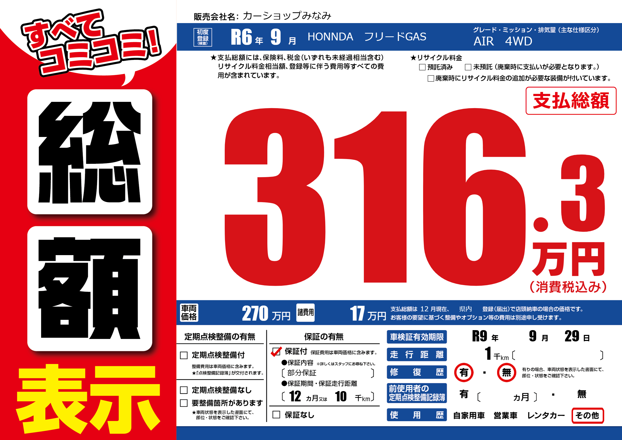 | 車名 | HONNDA フリードGAS | グレード ミッション 排気量 |