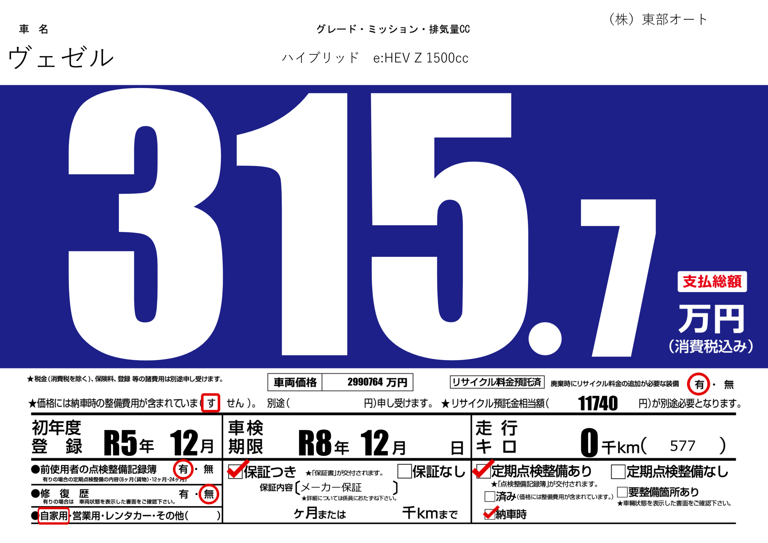 | 車名 | ヴェゼル | グレード ミッション 排気量 |