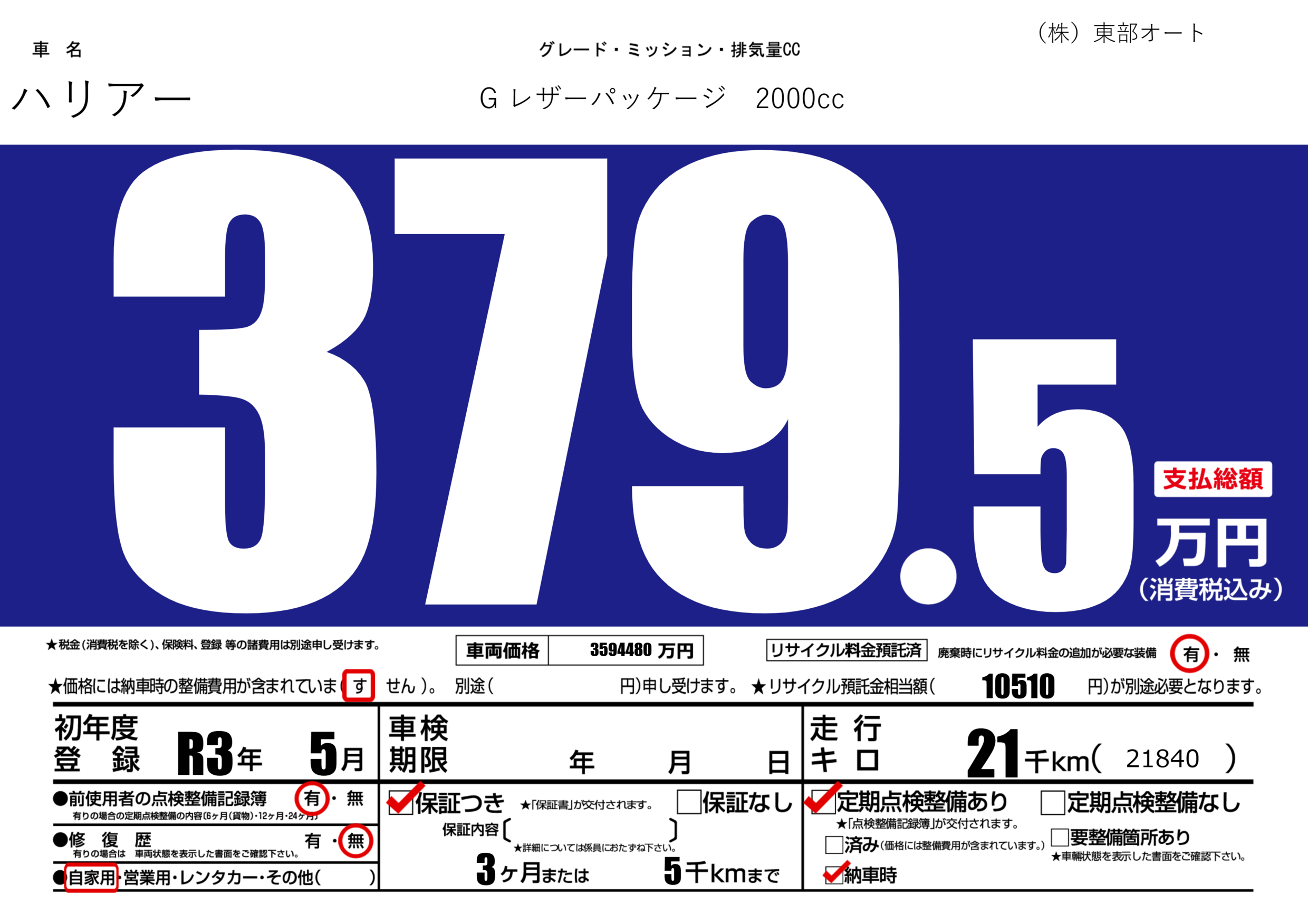 保証付き 保証内容(---) 3ヶ月または(5)千kmまで |