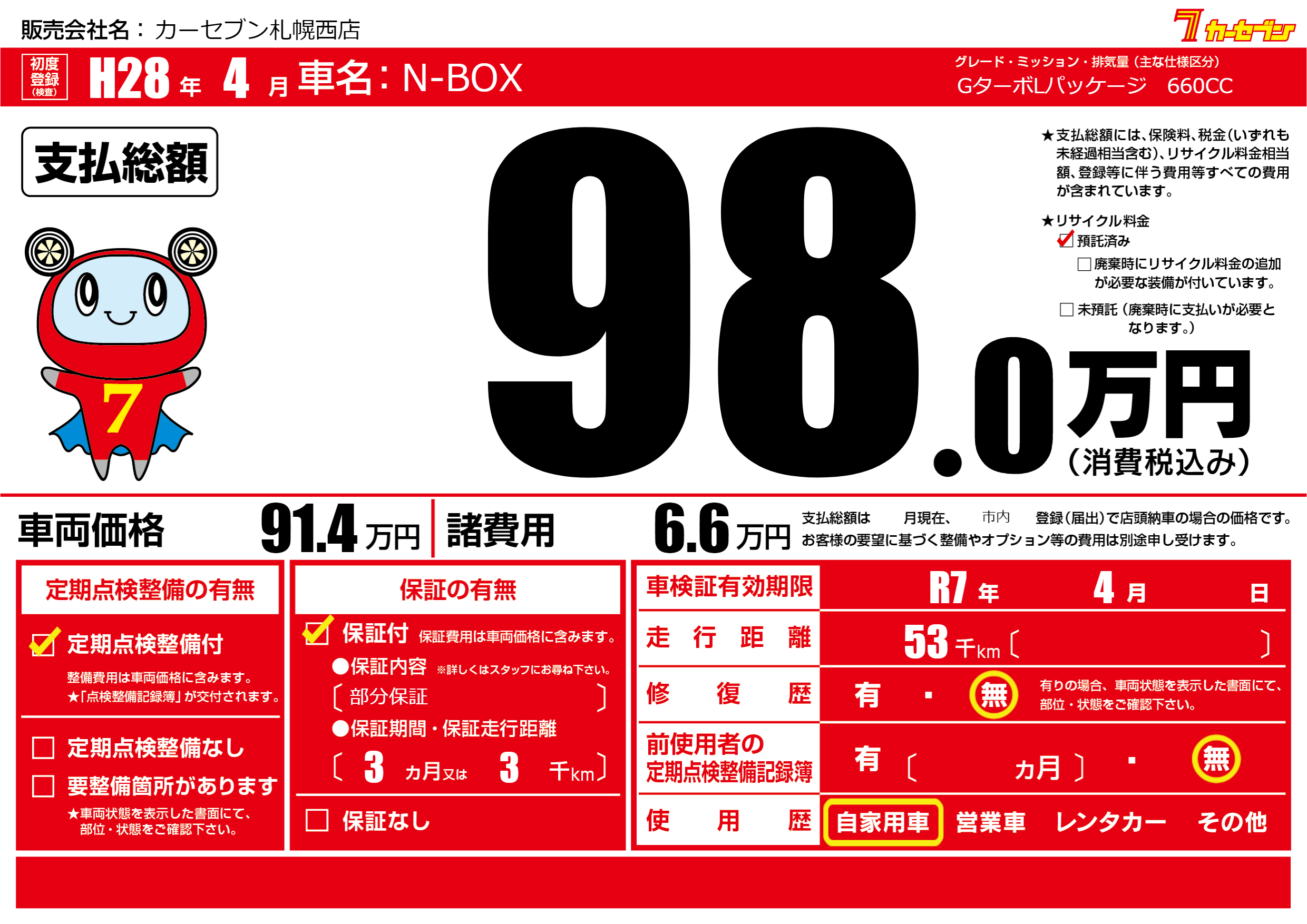 | 車名 | N-BOX | グレード ミッション 排気量 |