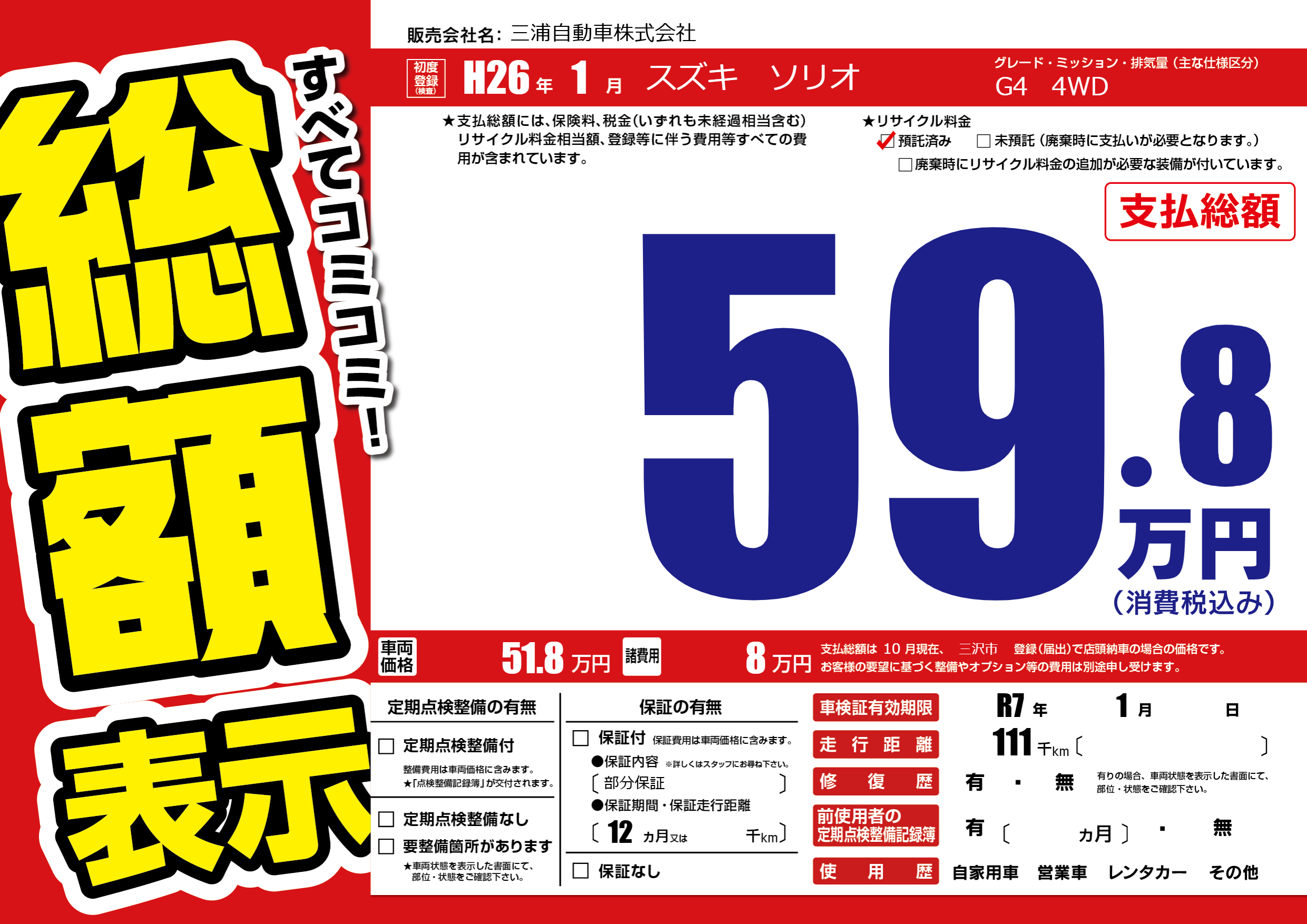 | 車名 | スズキ ソリオ | グレード ミッション 排気量 |