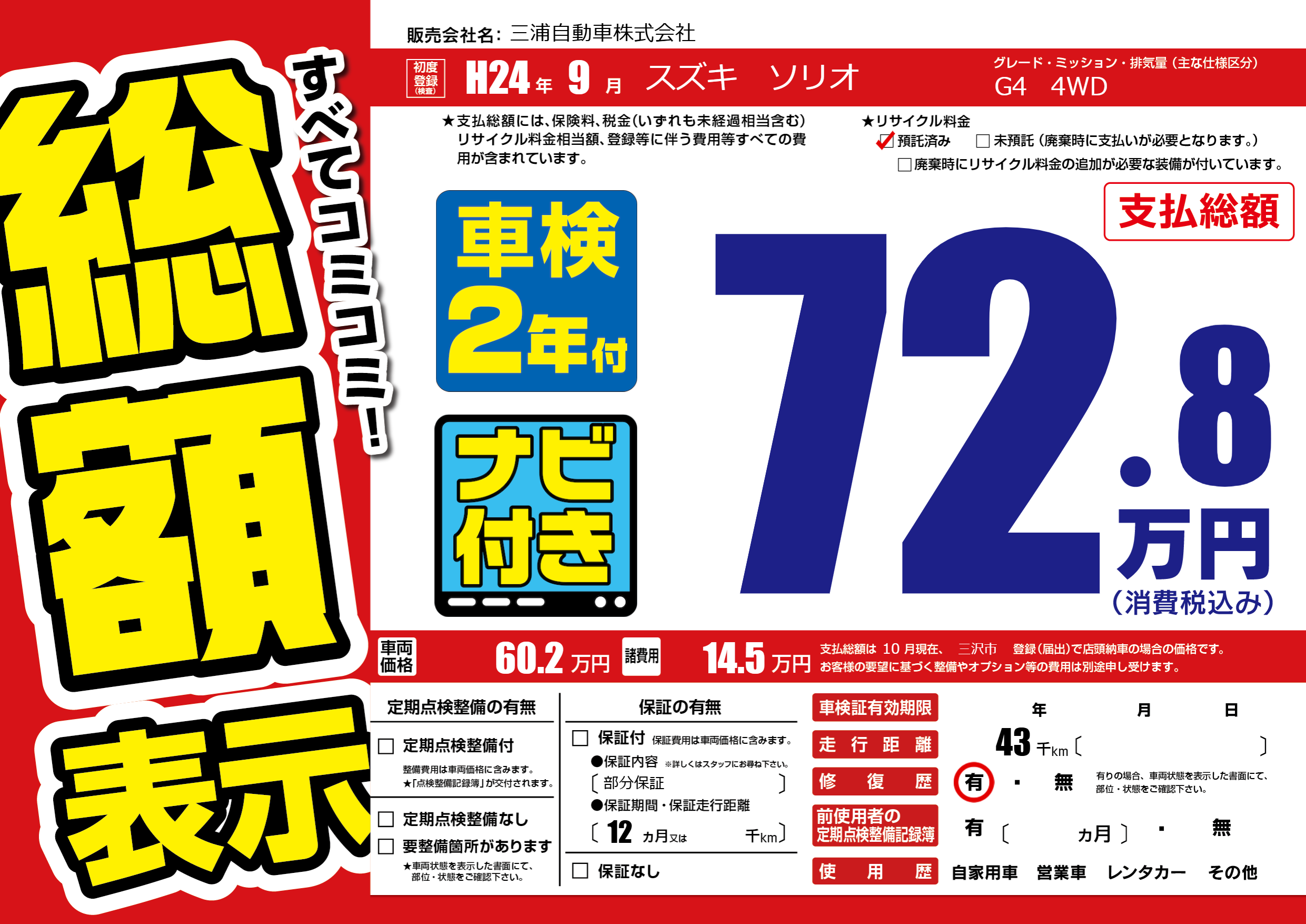 | 車名 | スズキ ソリオ | グレード ミッション 排気量 |