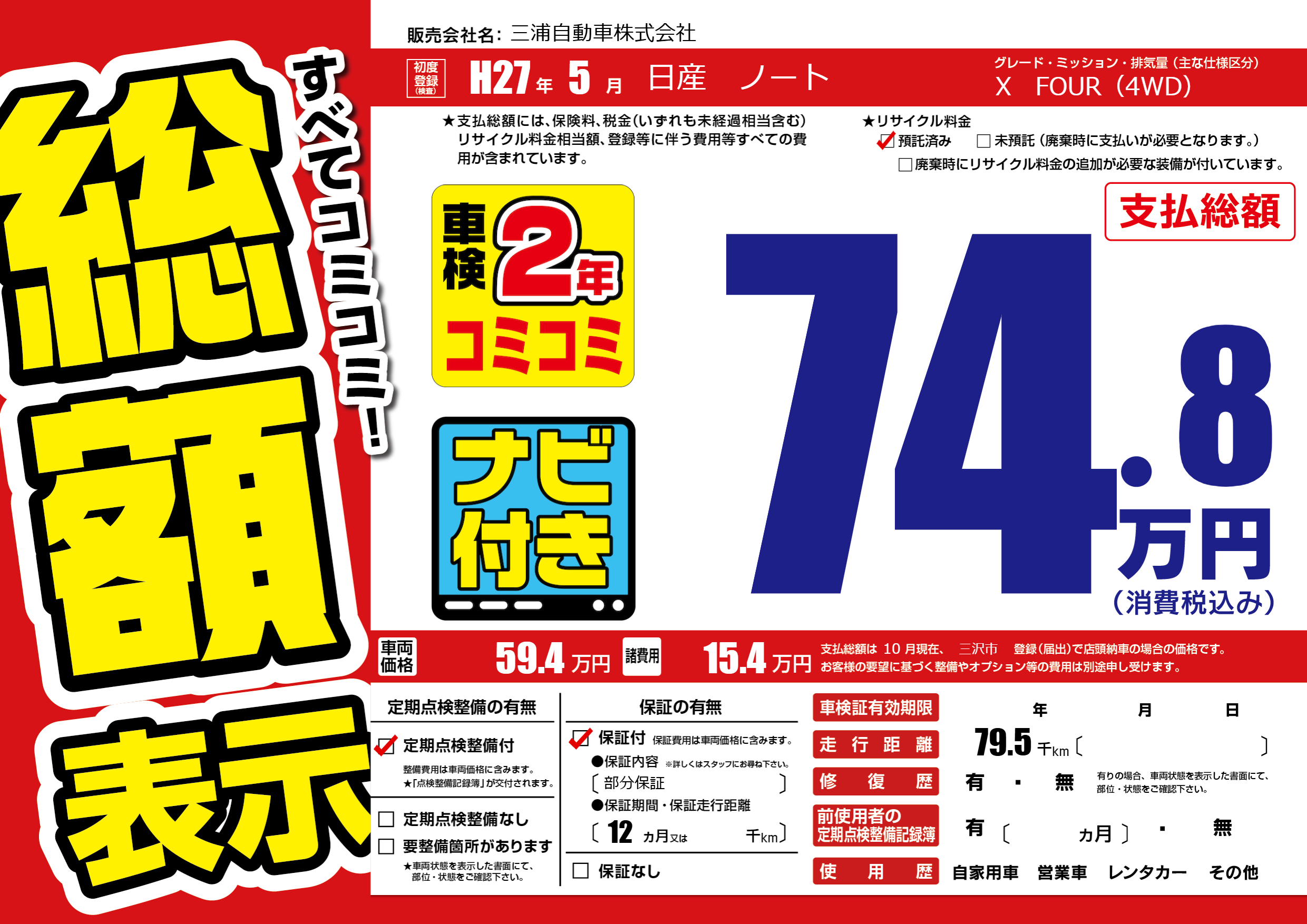 | 車名 | 日産 ノート | グレード ミッション 排気量 |