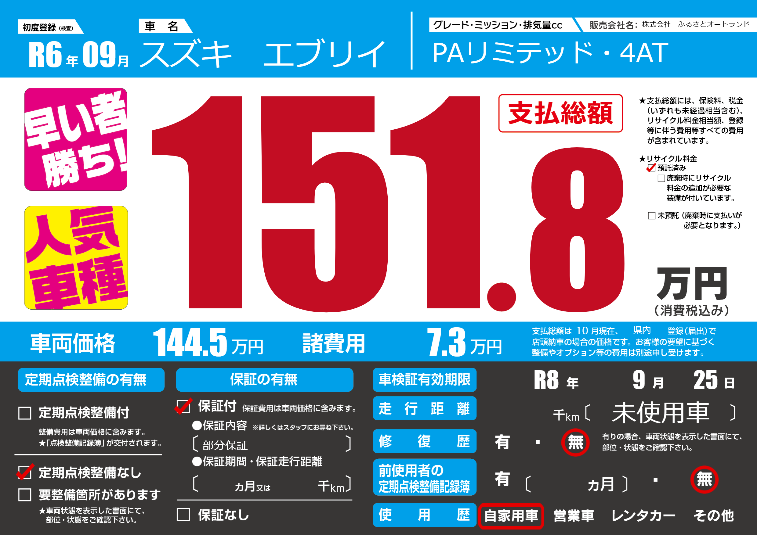 | 走行キロ | - | 初年度登録 | R6年09月 |