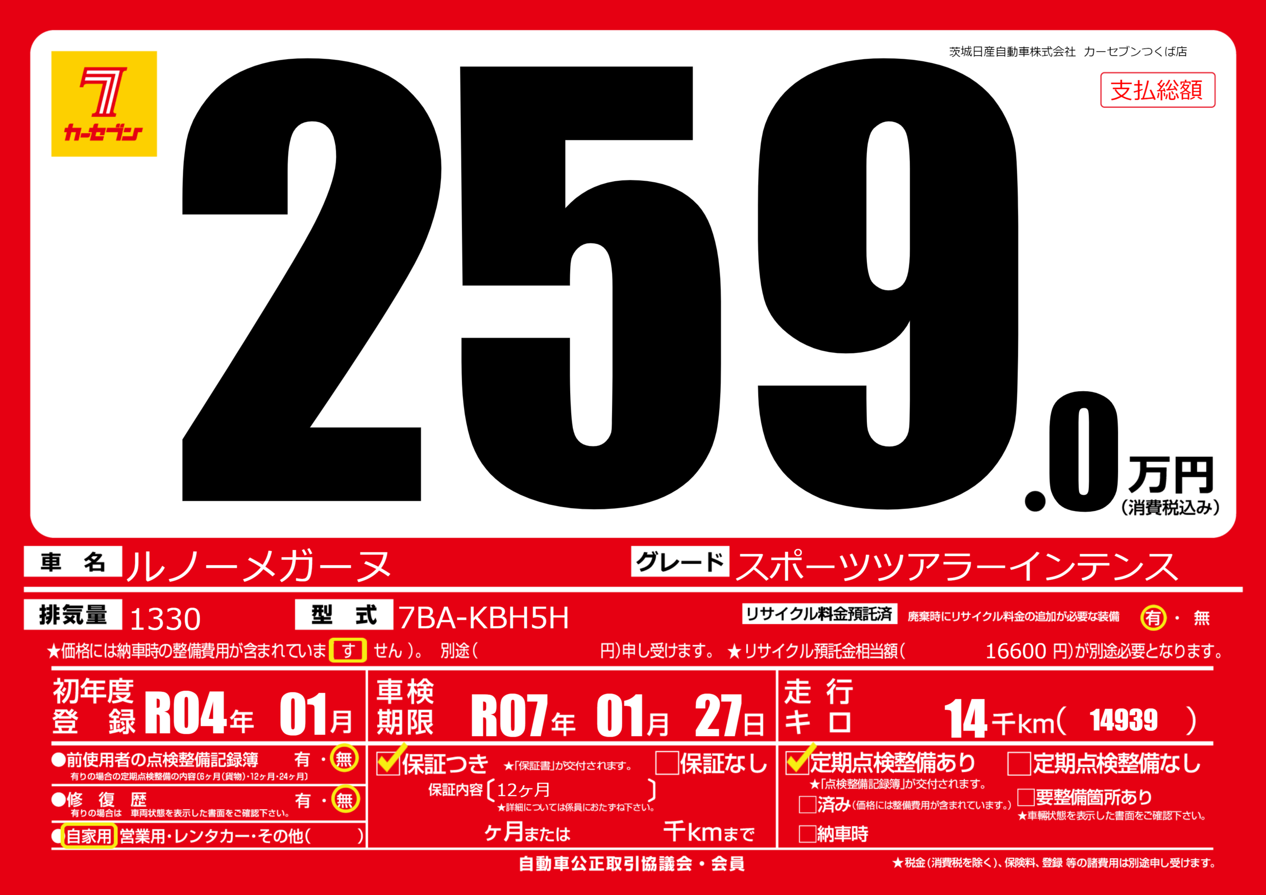 あり | リサイクル預託金相当額 | ( 16600円)が別途必要 |