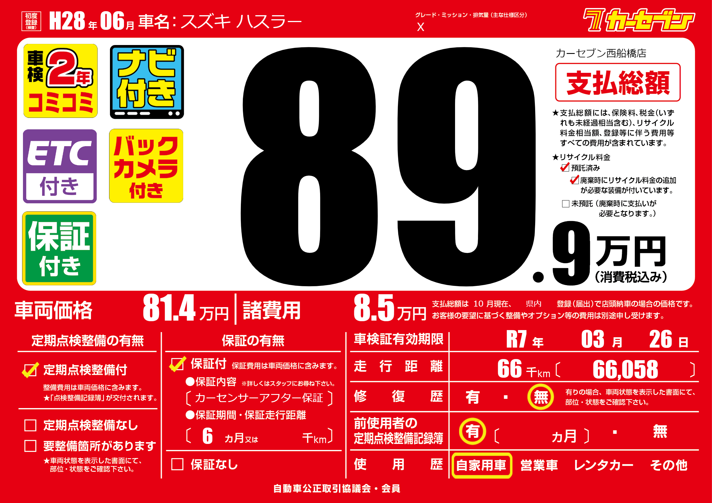 | 車名 | スズキ ハスラー | グレード ミッション 排気量 |