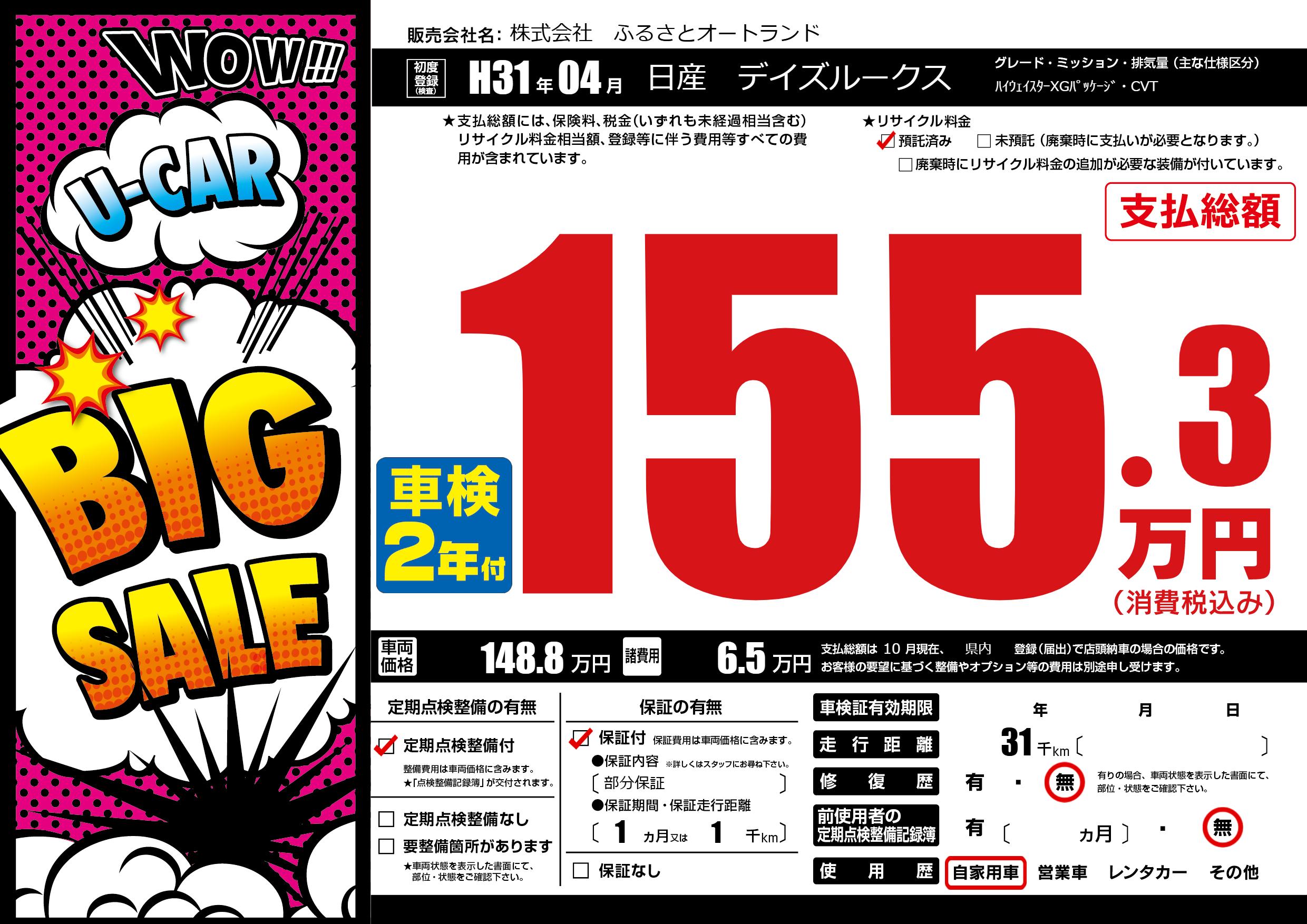 | 車名 | 日産 デイズルークス | グレード ミッション 排気量 |