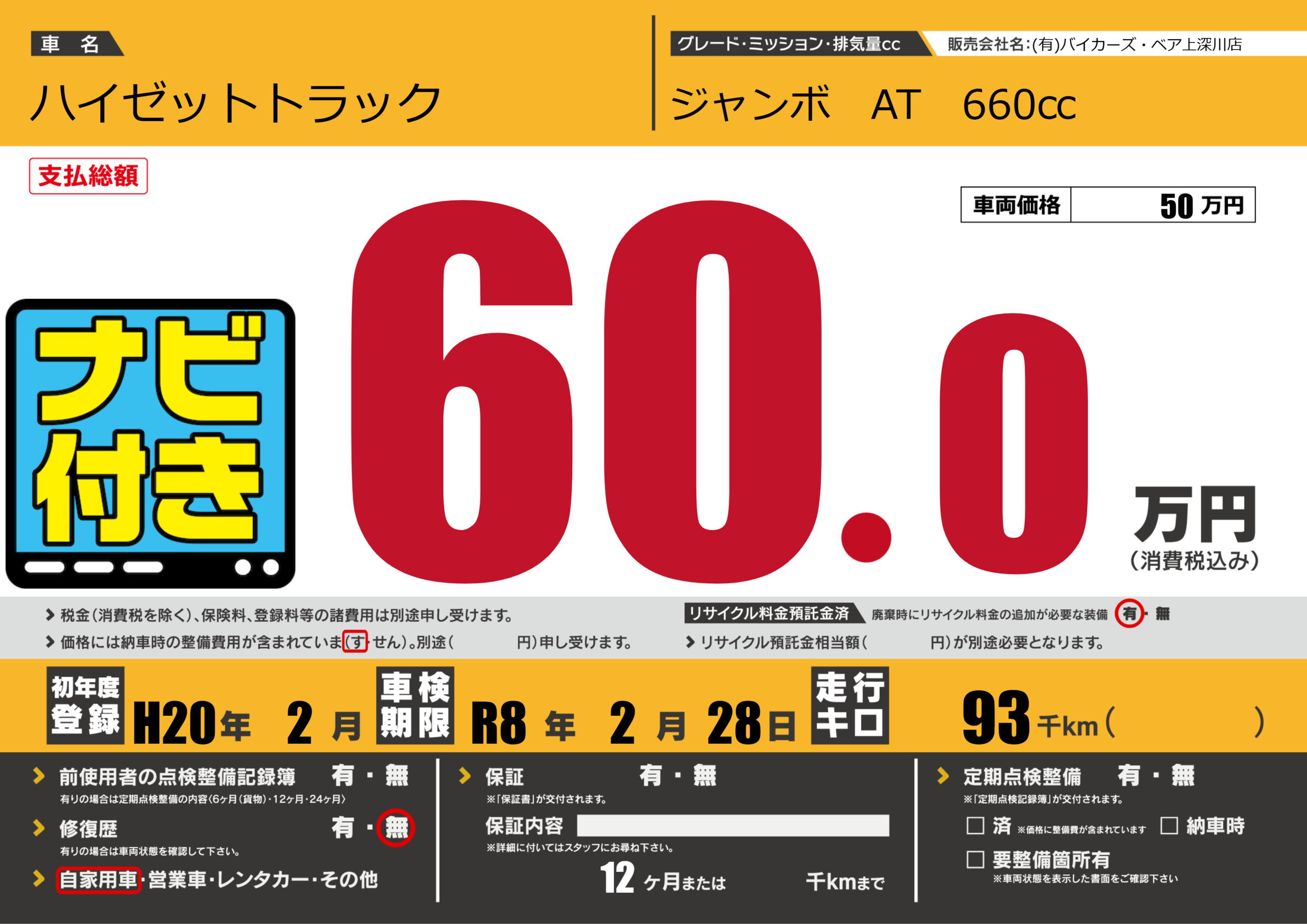 | 走行キロ | 9.3万km | 初年度登録 | H20年2月 |