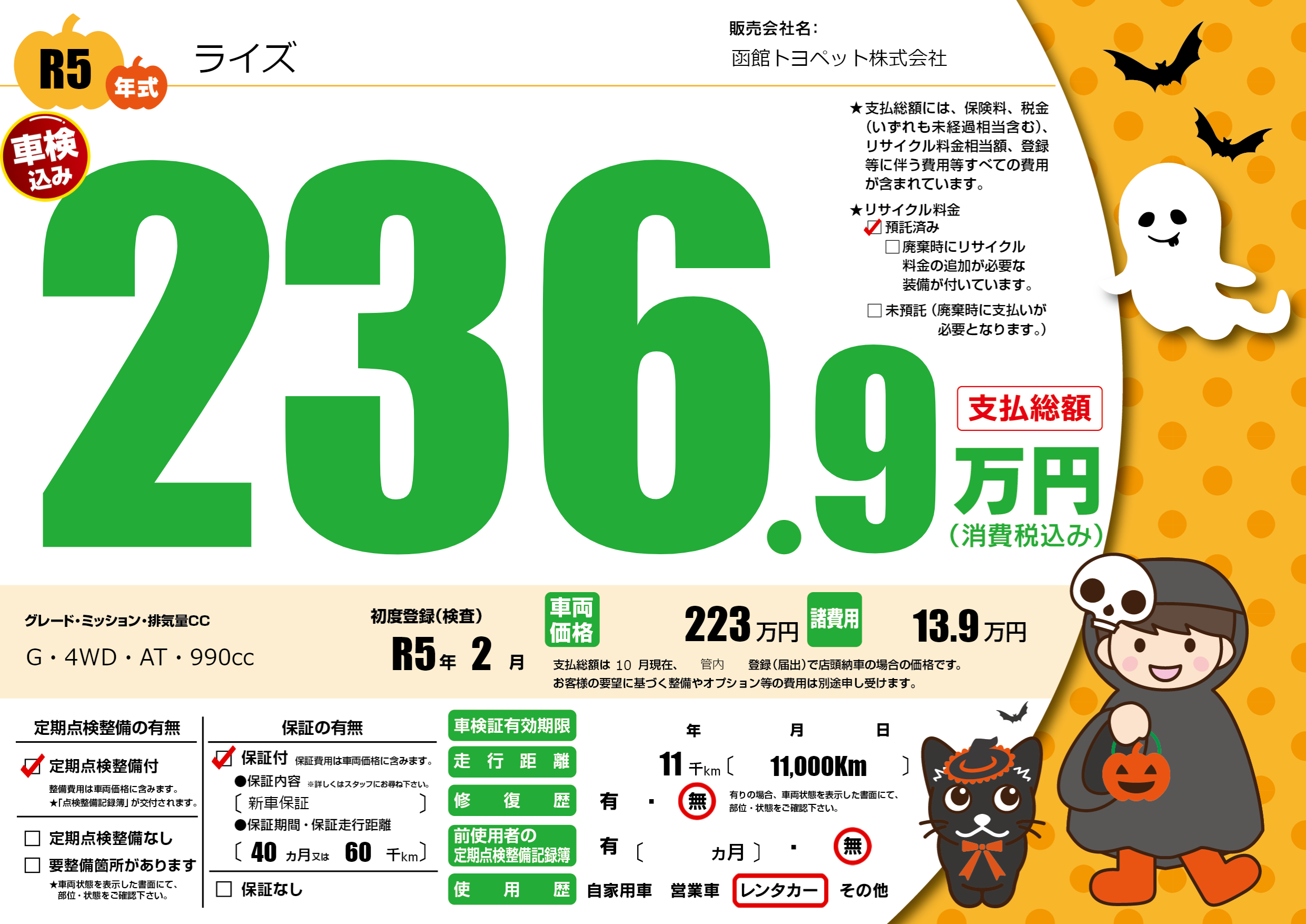 | 走行キロ | 1.1万km | 初年度登録 | R5年2月 |