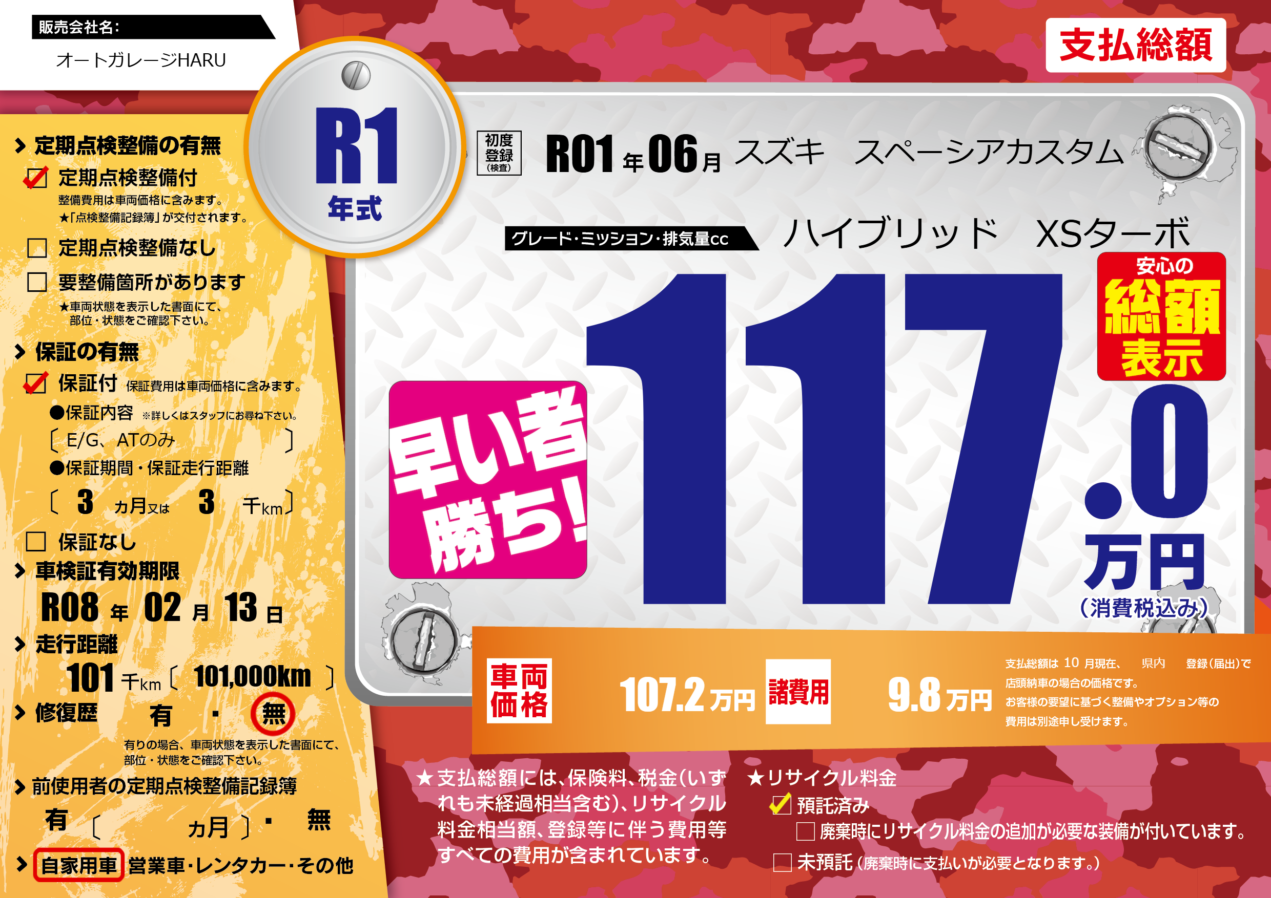 | 車名 | スズキ スペーシアカスタム | グレード ミッション 排気量 |