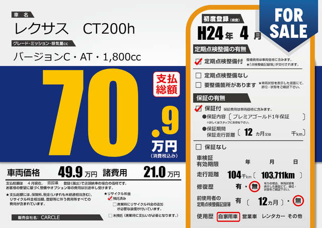 | 車名 | レクサス CT200h | グレード ミッション 排気量 |