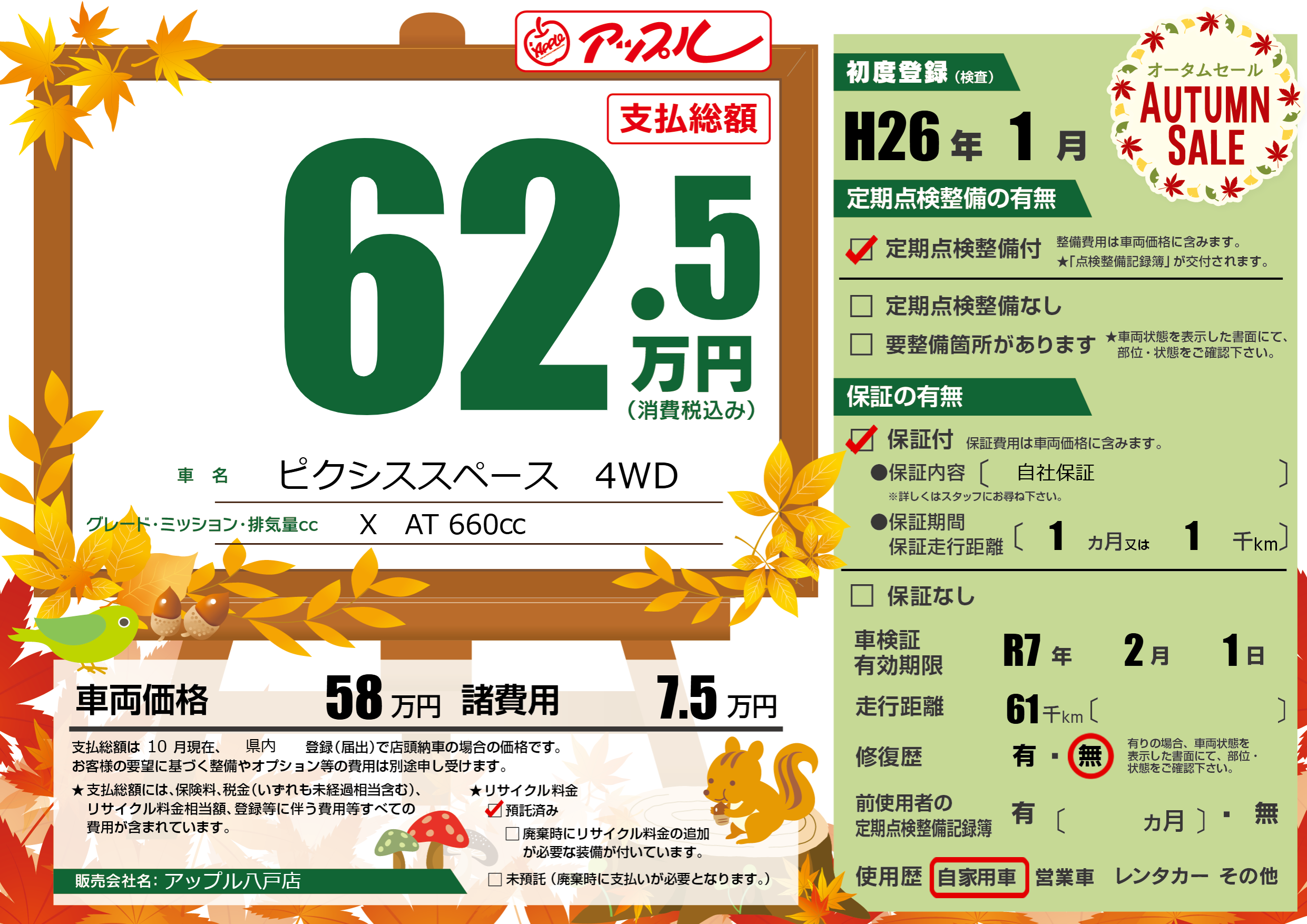 保証付き 保証内容( 自社保証) 1ヶ月または(1)千kmまで |