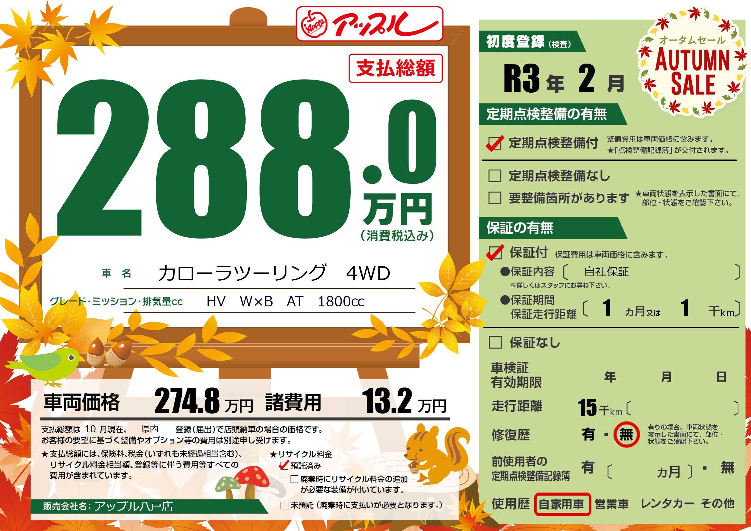 保証付き 保証内容( 自社保証) 1ヶ月または(1)千kmまで |
