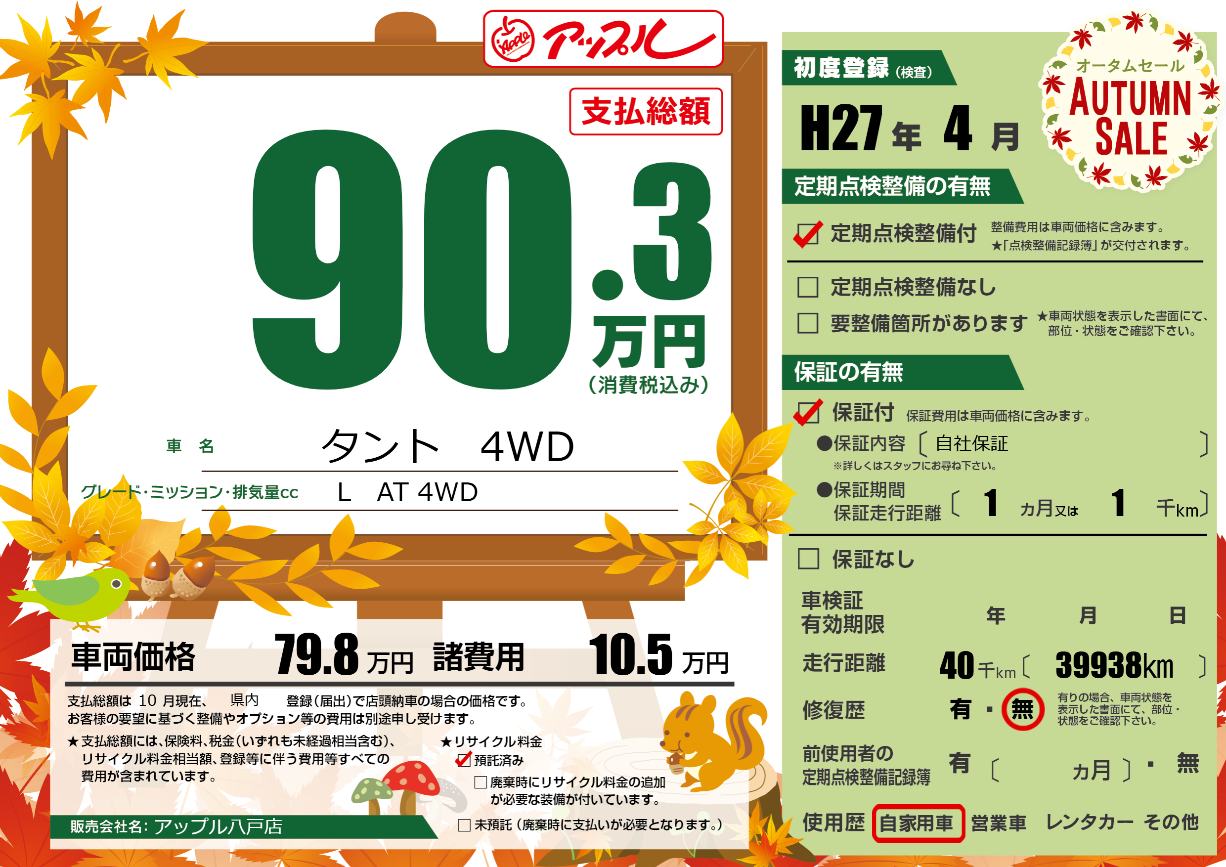 | 車名 | タント 4WD | グレード ミッション 排気量 |