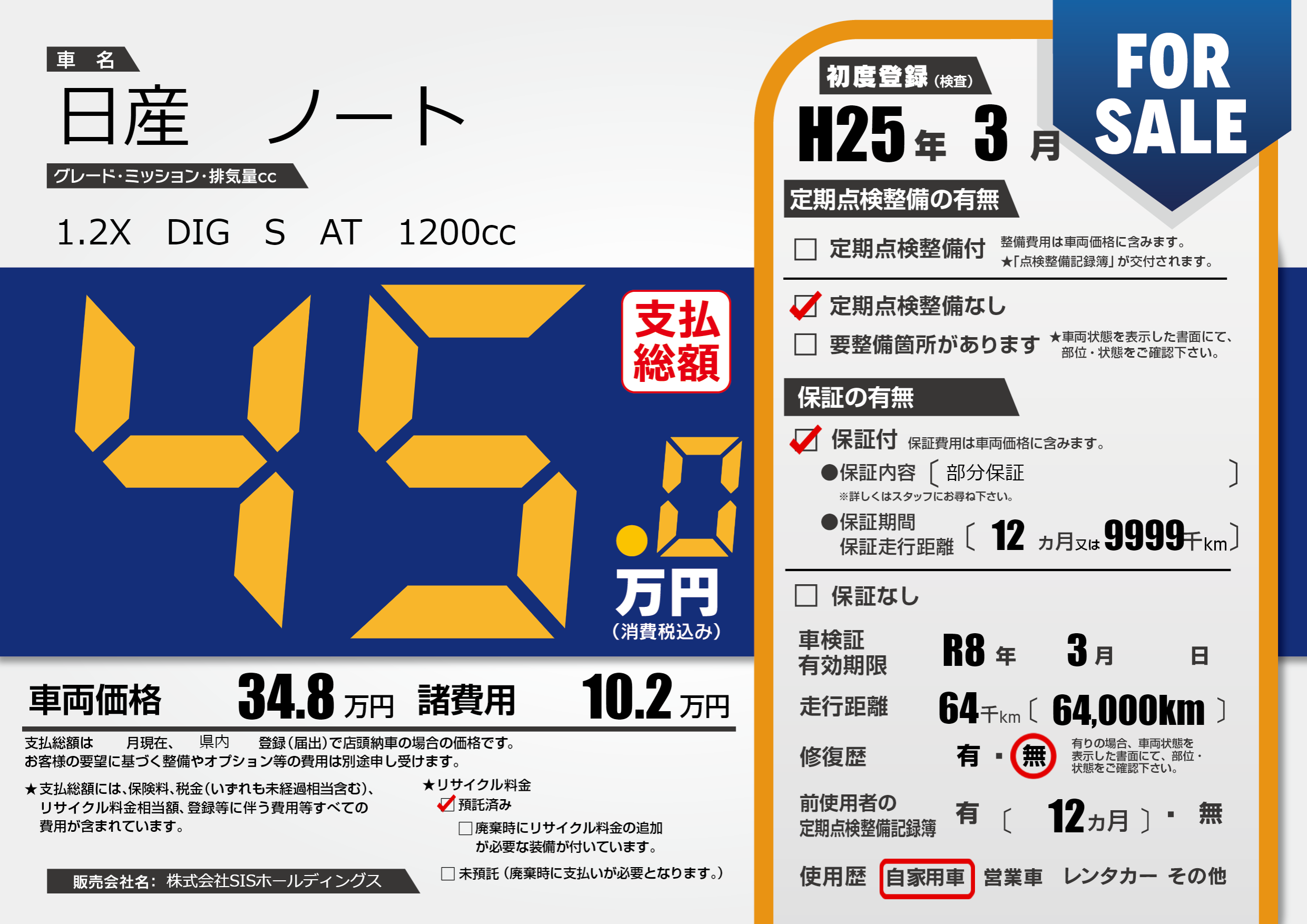 | 車名 | 日産 ノート | グレード ミッション 排気量 |