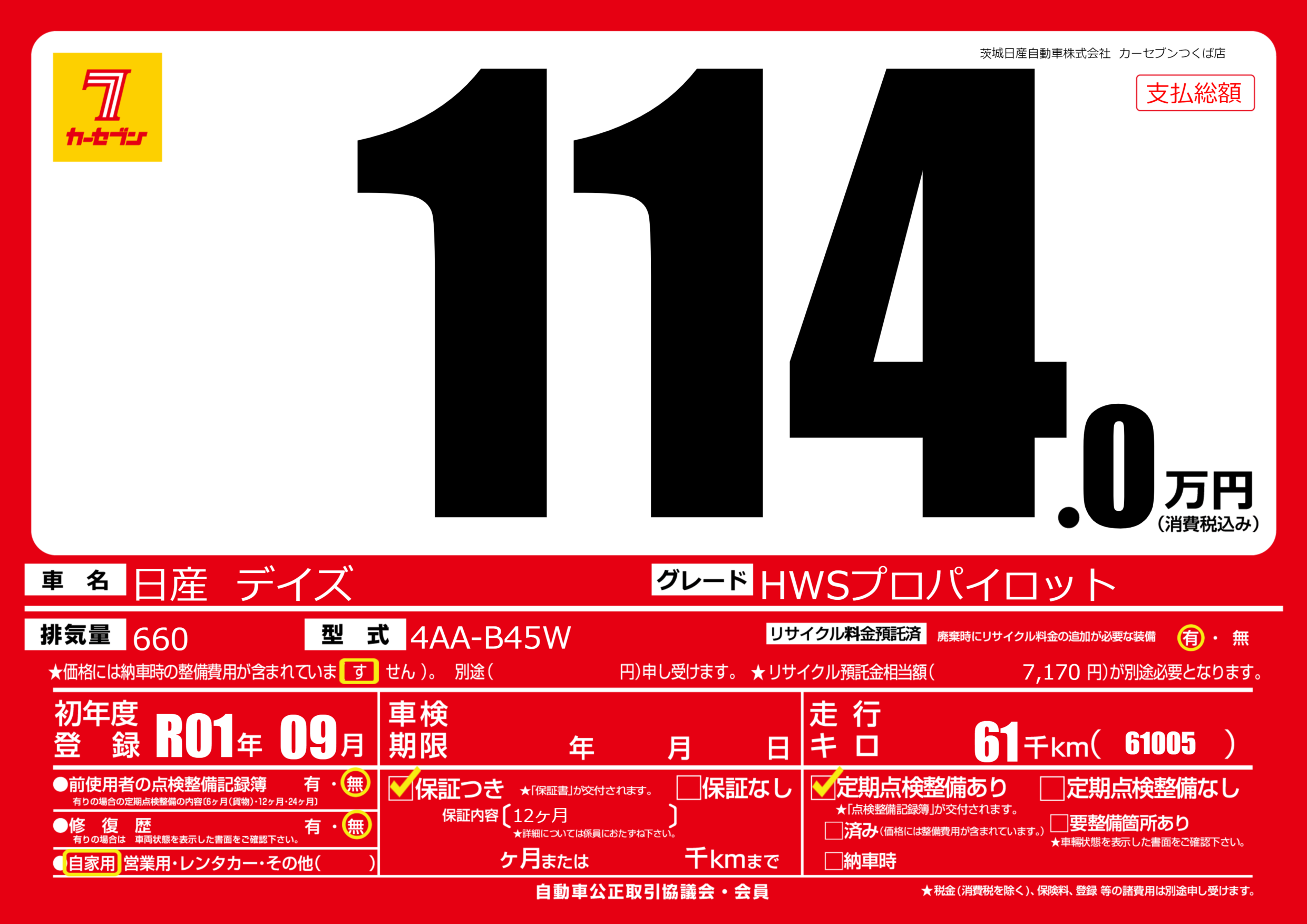 | 車名 | 日産 デイズ | グレード ミッション 排気量 |
