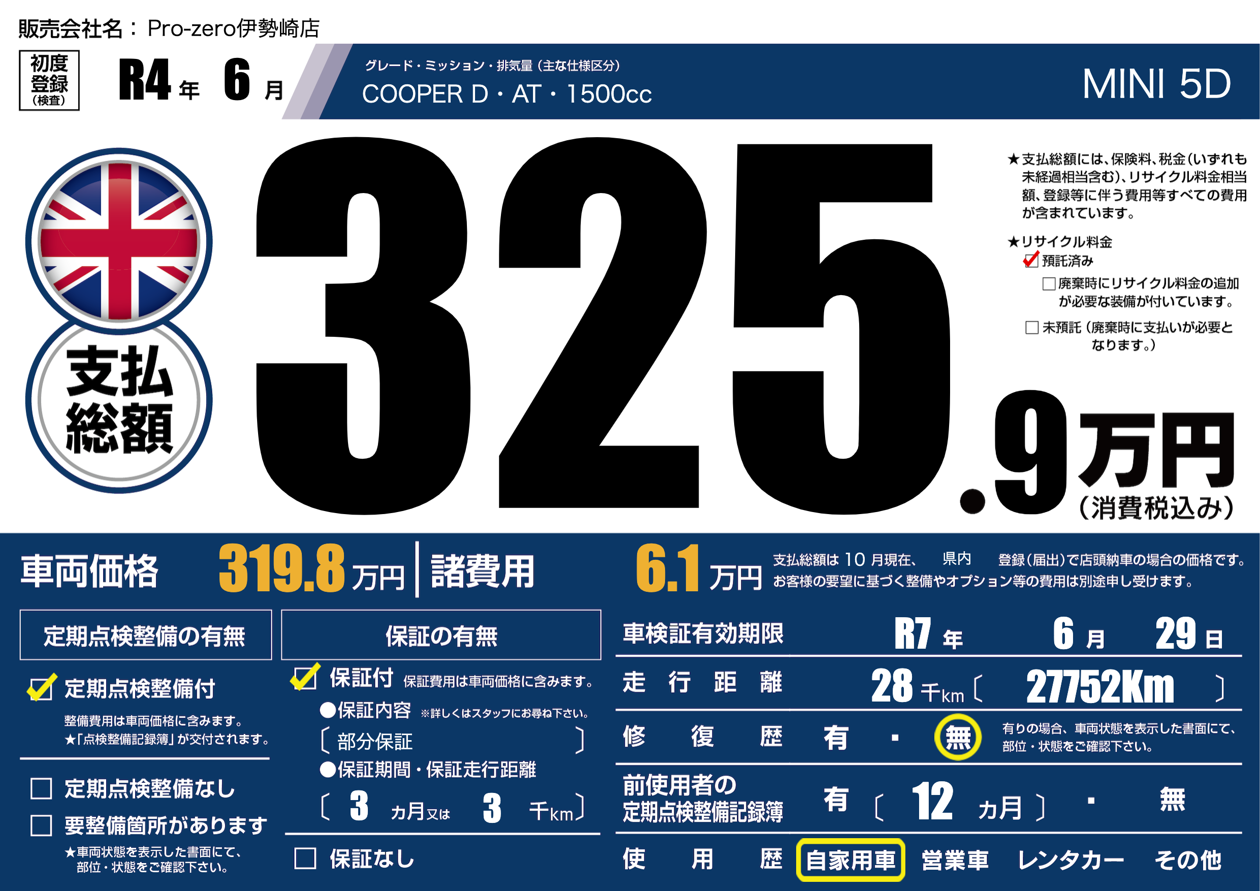 | 車名 | MINI 5D | グレード ミッション 排気量 |