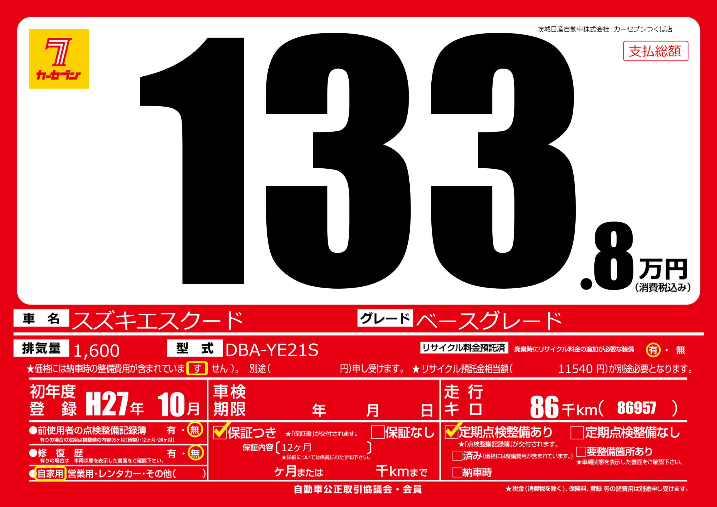 | 車名 | スズキエスクード | グレード ミッション 排気量 |