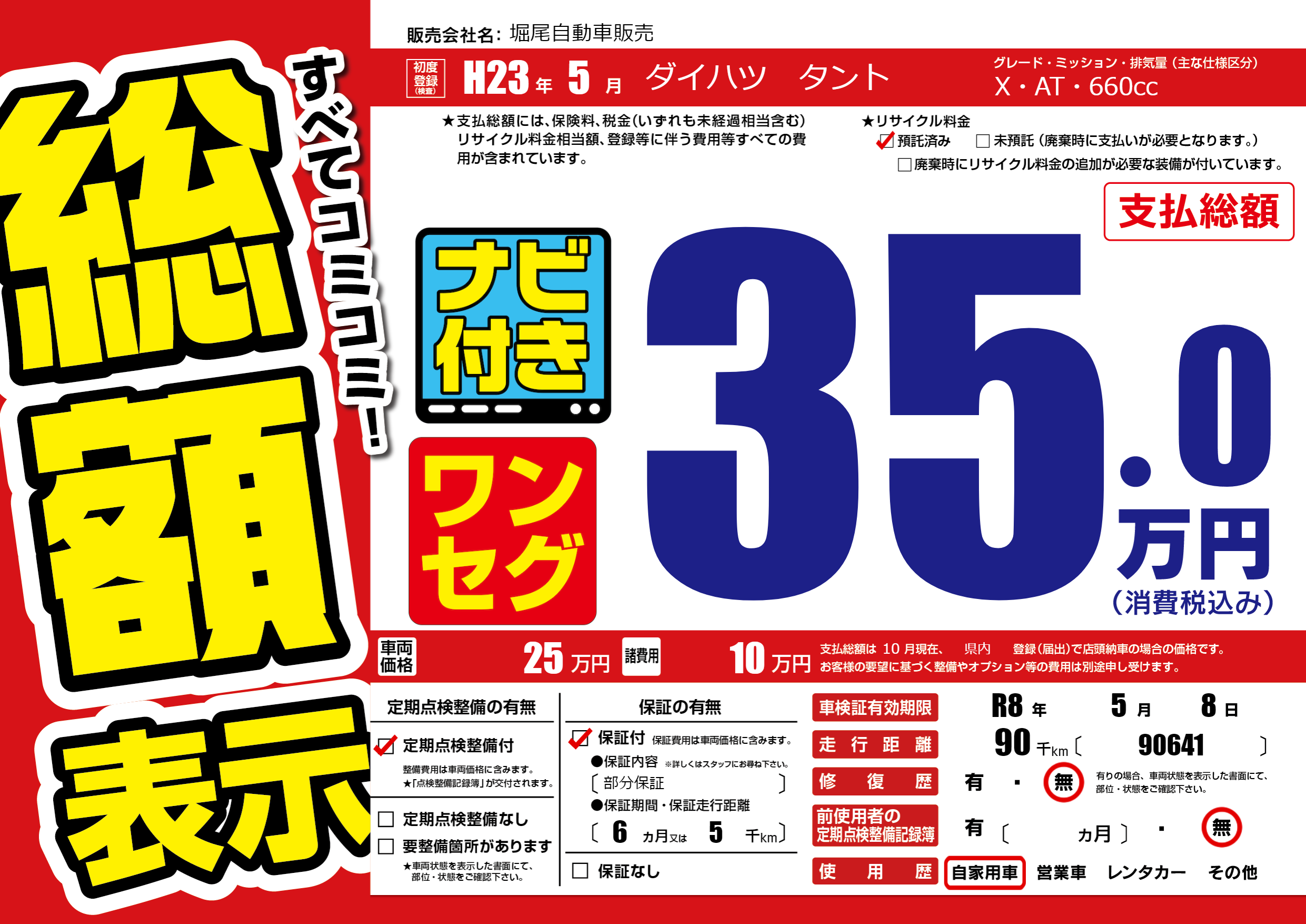 | 走行キロ | 9万km | 初年度登録 | H23年5月 |