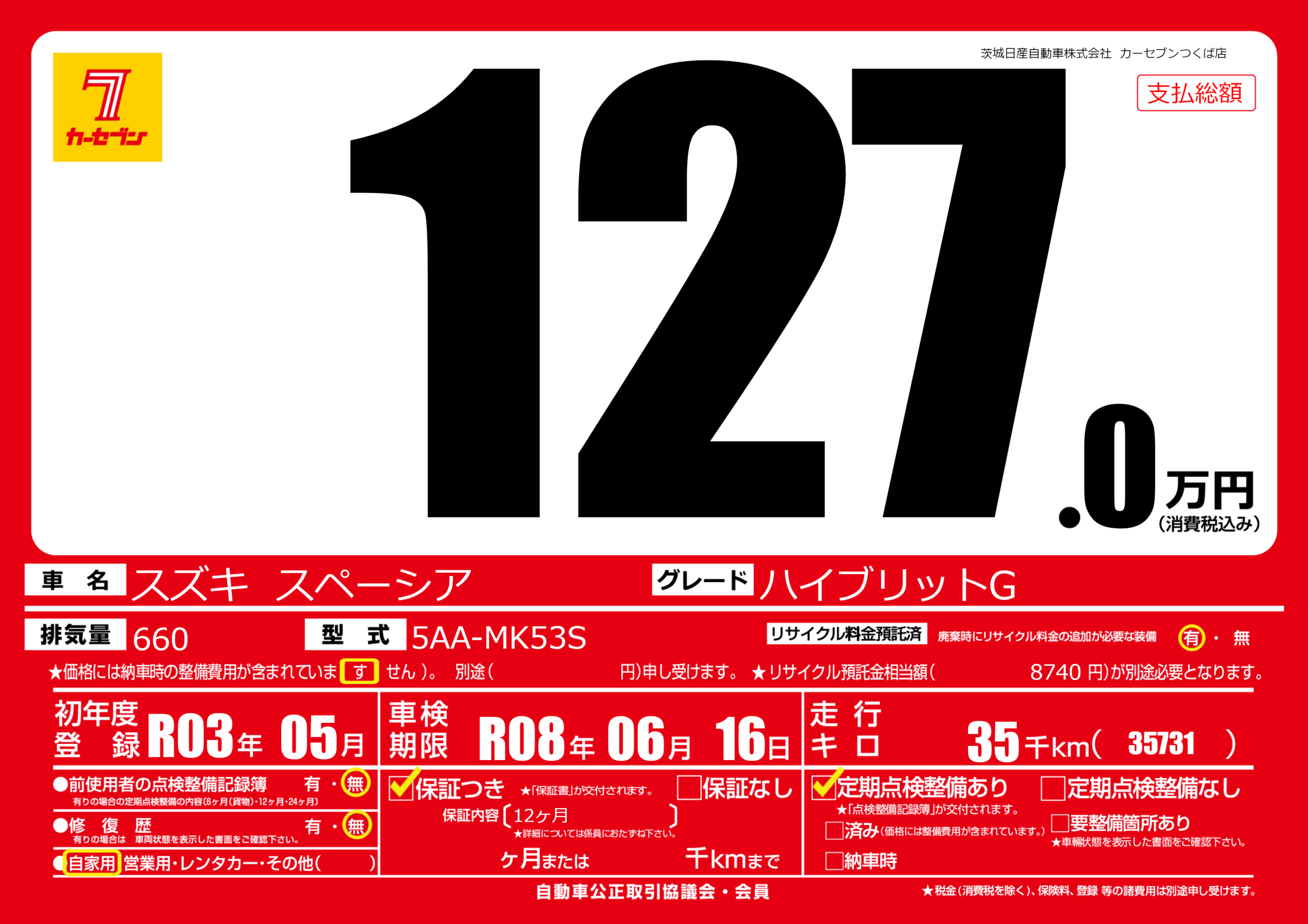 保証付き 保証内容(12ヶ月) ---ヶ月または()千kmまで |