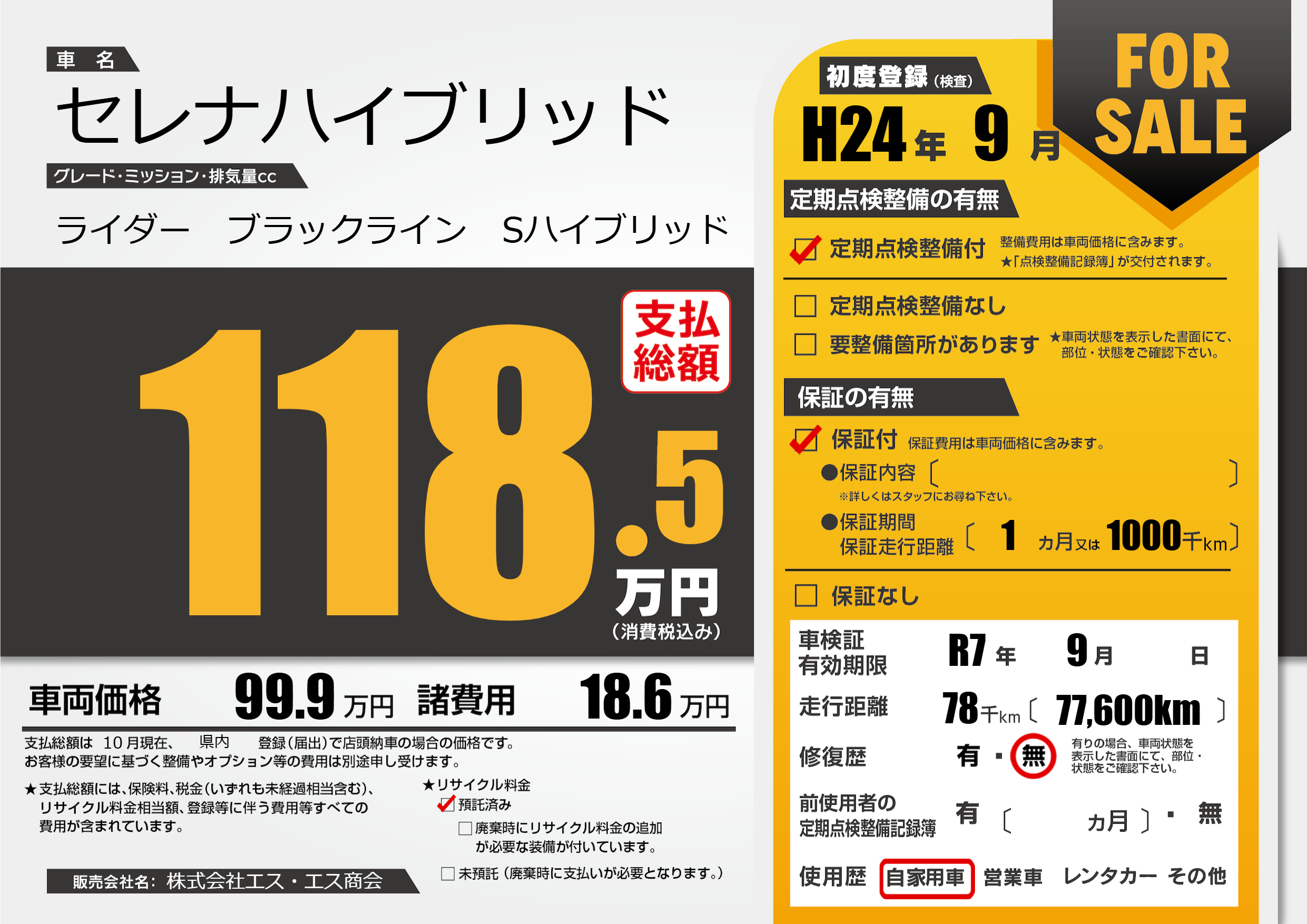 | 走行キロ | 7.8万km | 初年度登録 | H24年9月 |