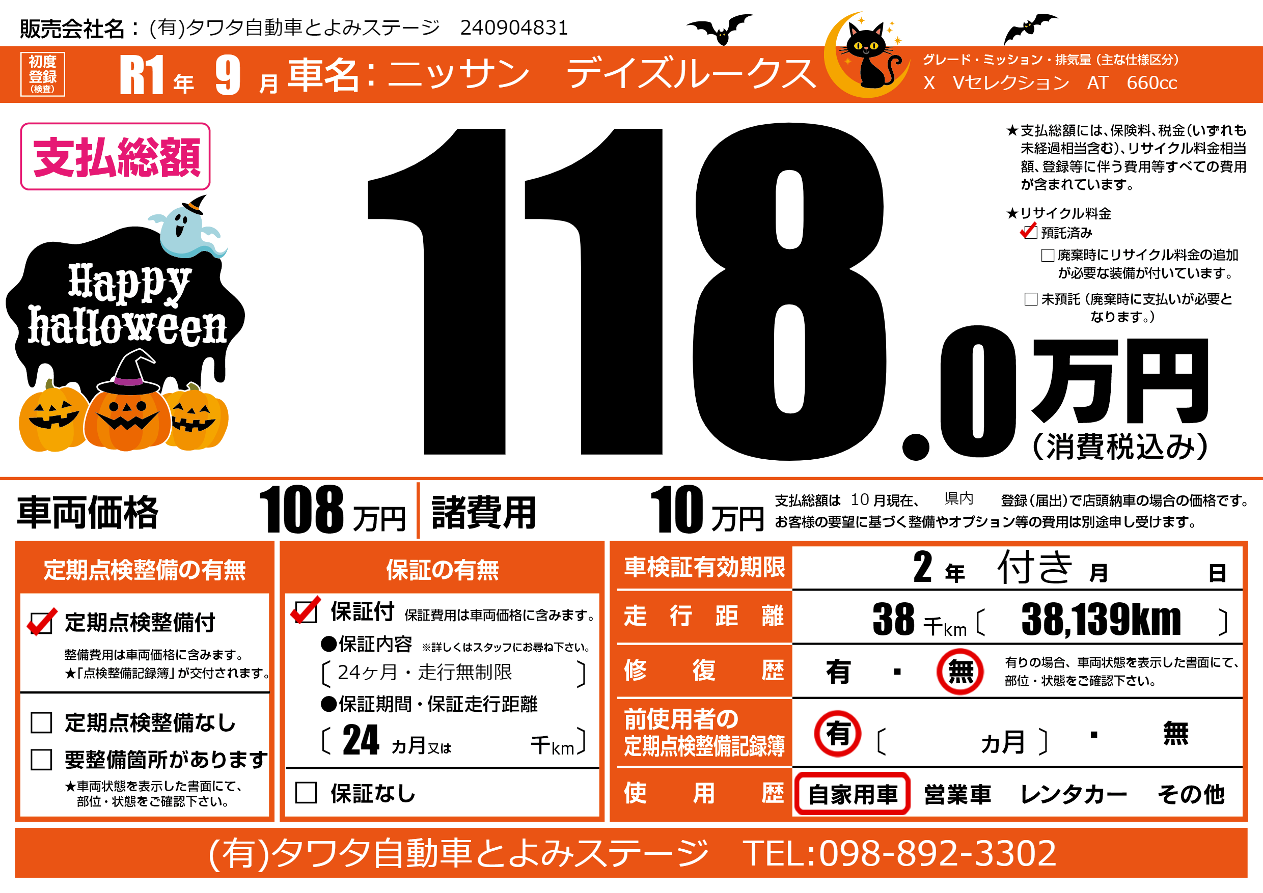 | 走行キロ | 3.8万km | 初年度登録 | R1年9月 |