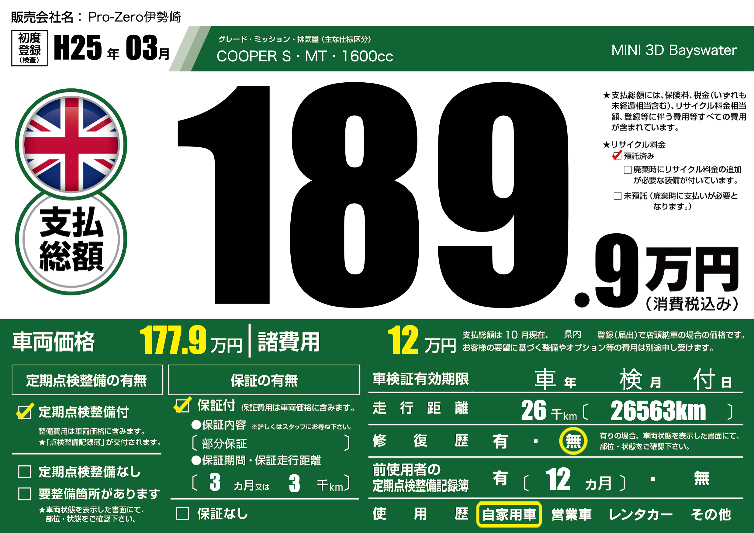 | 車名 | MINI 3D Bayswater | グレード ミッション 排気量 |
