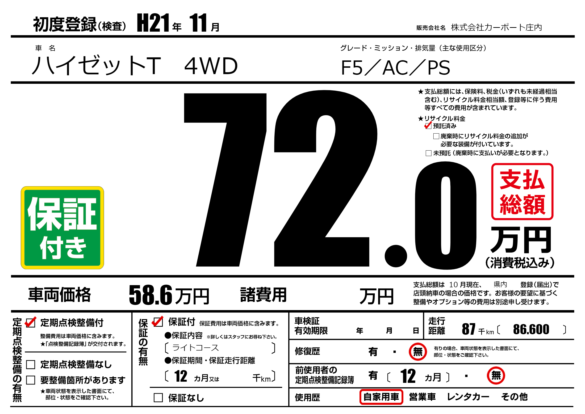 | 車名 | ハイゼットT 4WD | グレード ミッション 排気量 |