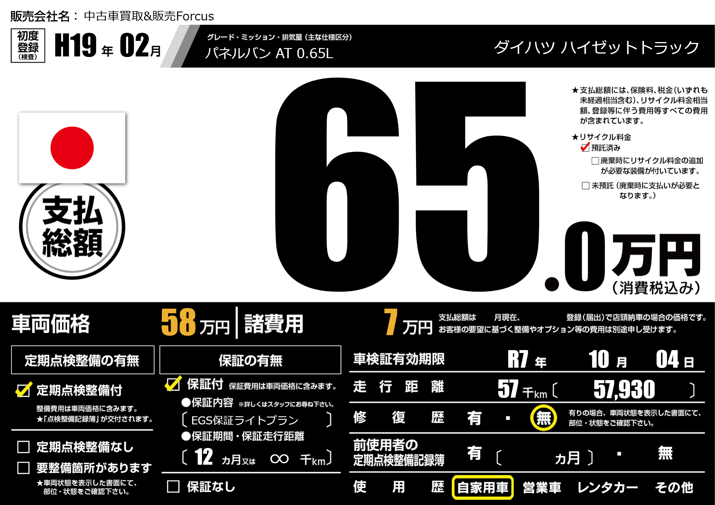 | 走行キロ | 5.7万km | 初年度登録 | H19年02月 |