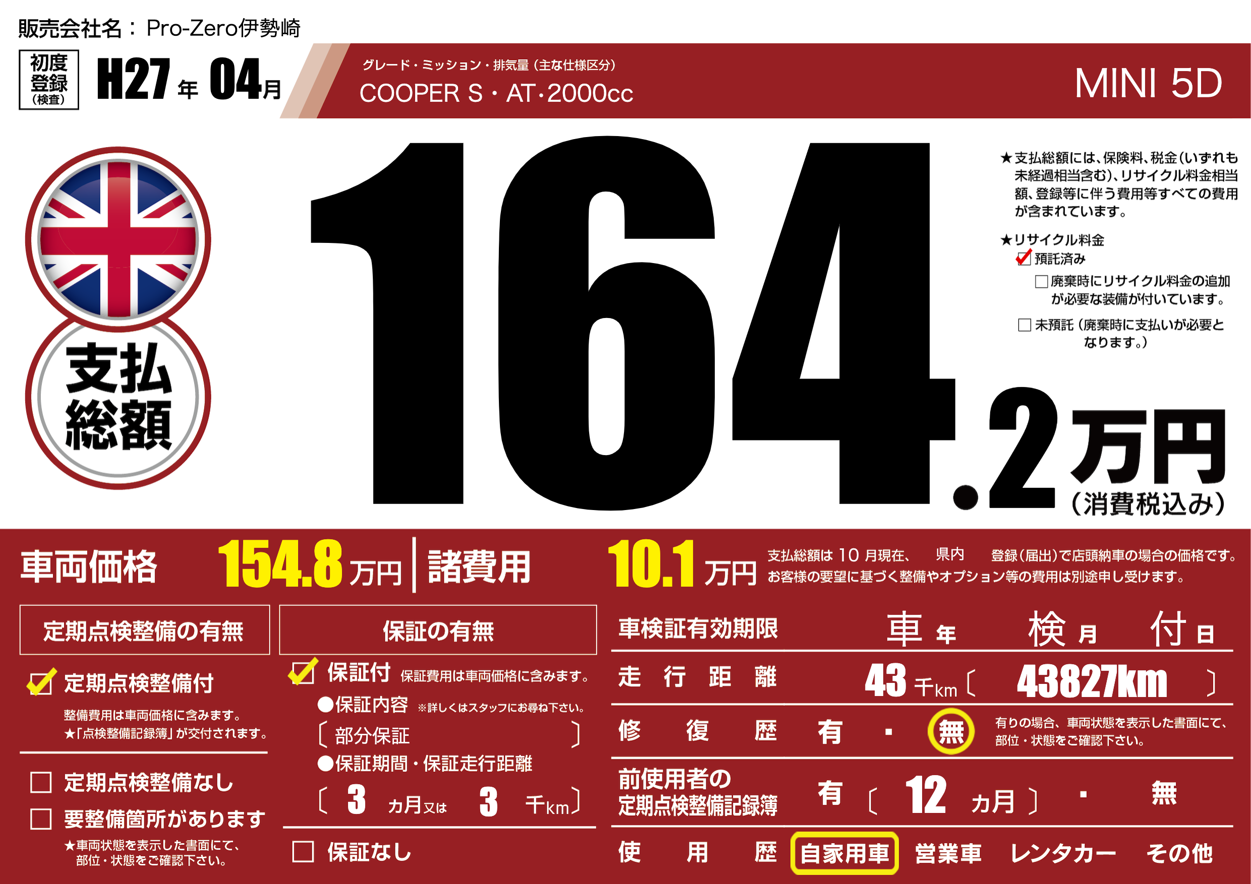 | 車名 | MINI 5D | グレード ミッション 排気量 |