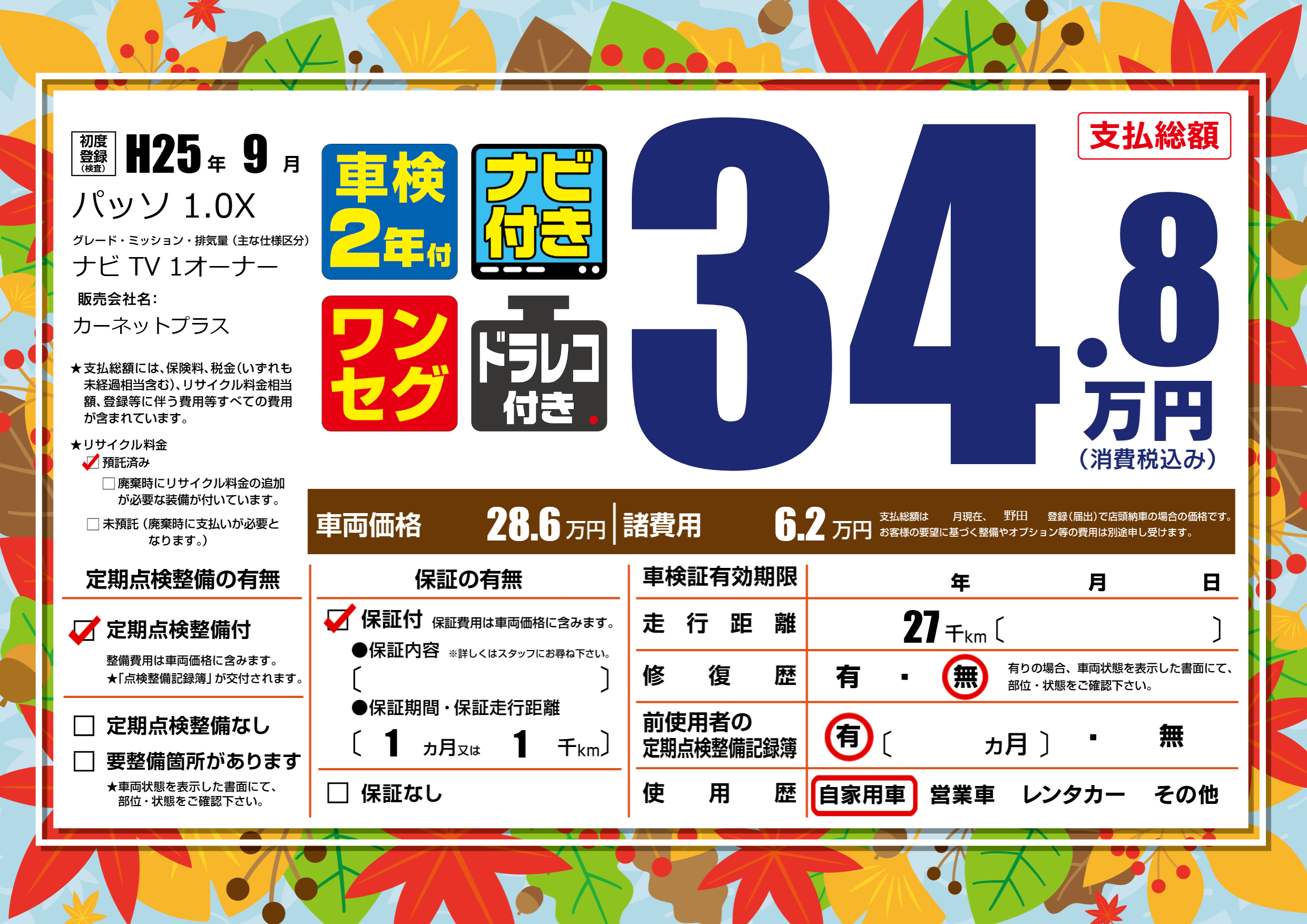 | 車名 | パッソ 1.0X | グレード ミッション 排気量 |
