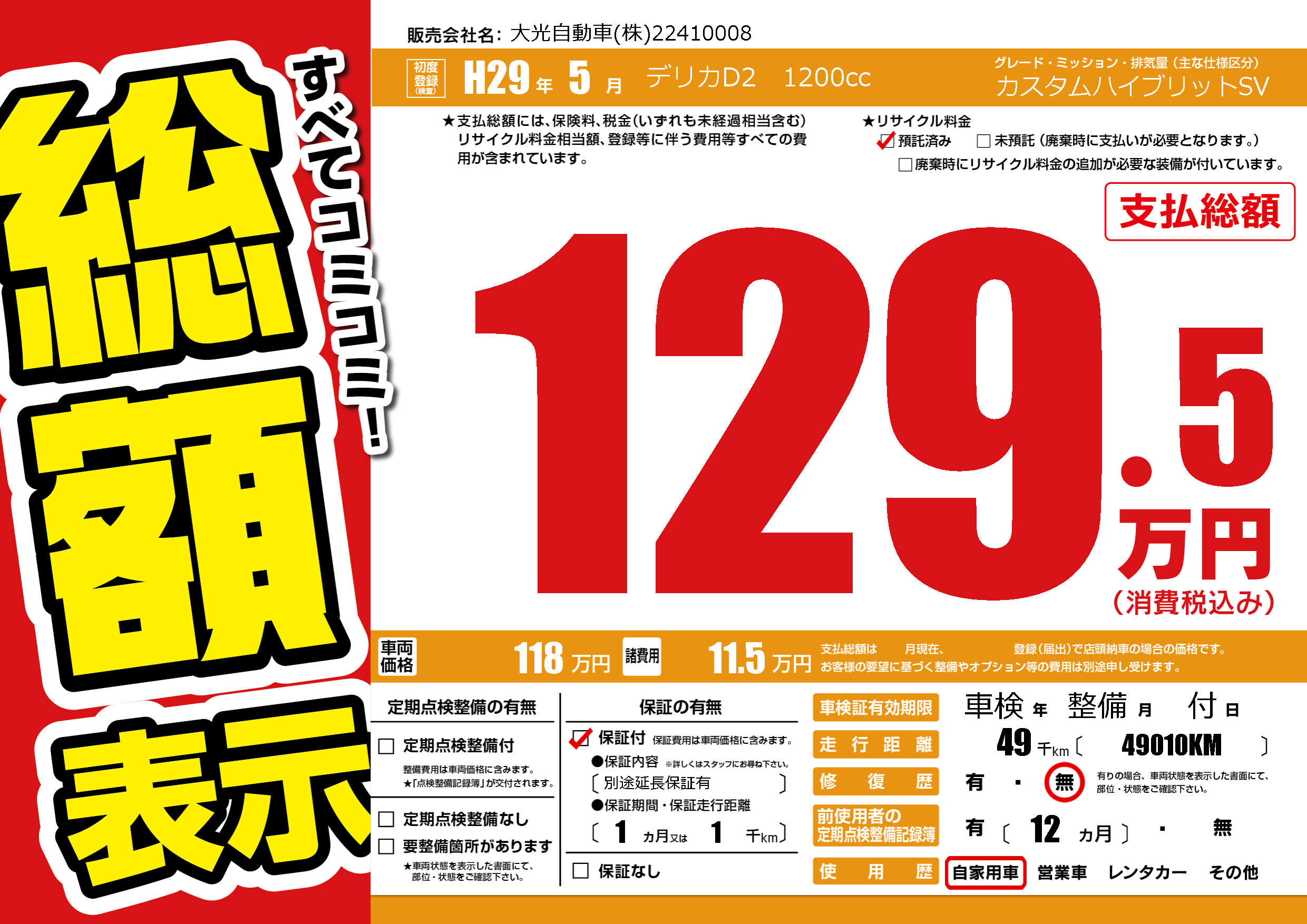 | 走行キロ | 4.9万km | 初年度登録 | H29年5月 |