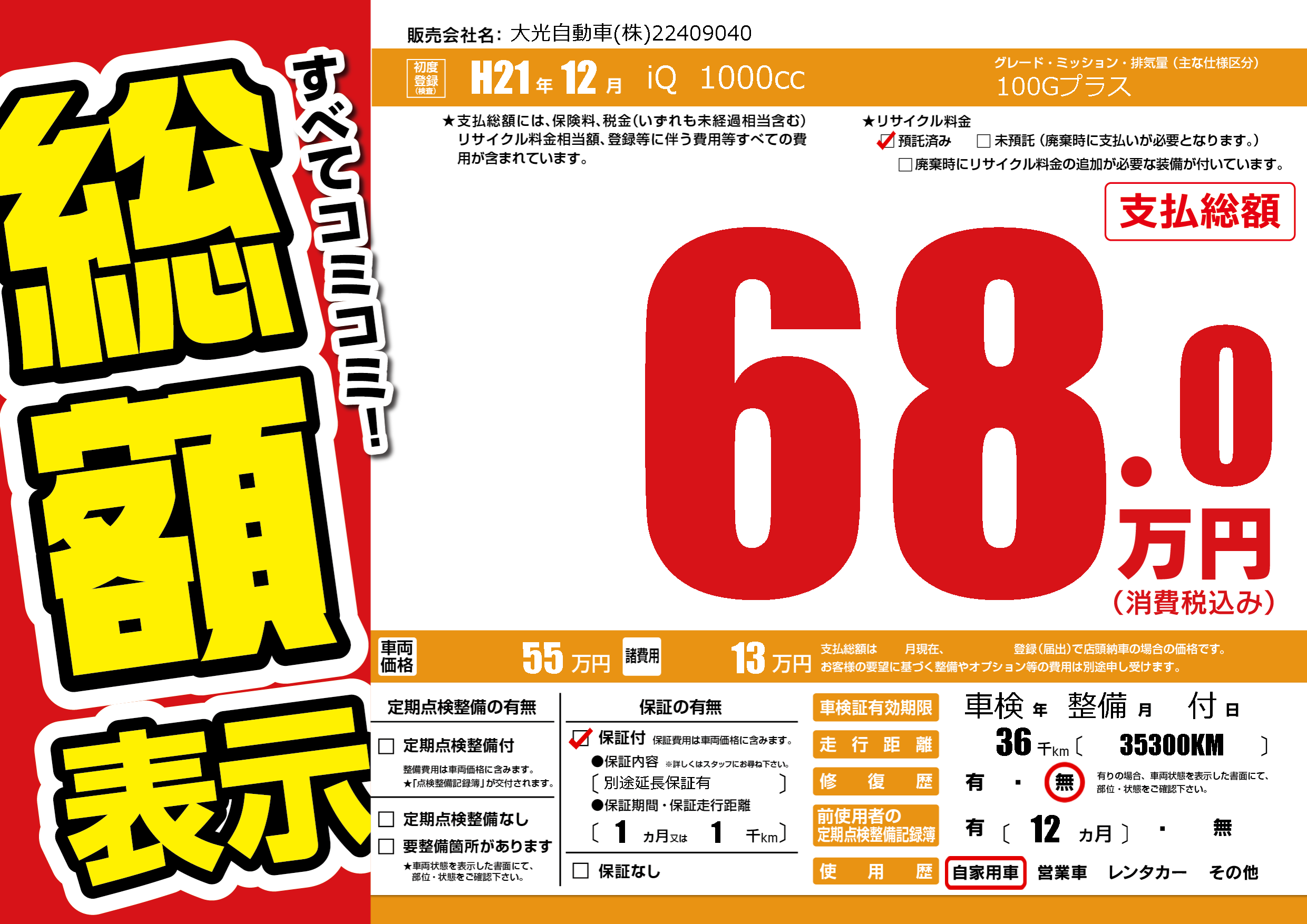 | 車名 | iQ 1000cc | グレード ミッション 排気量 |